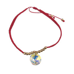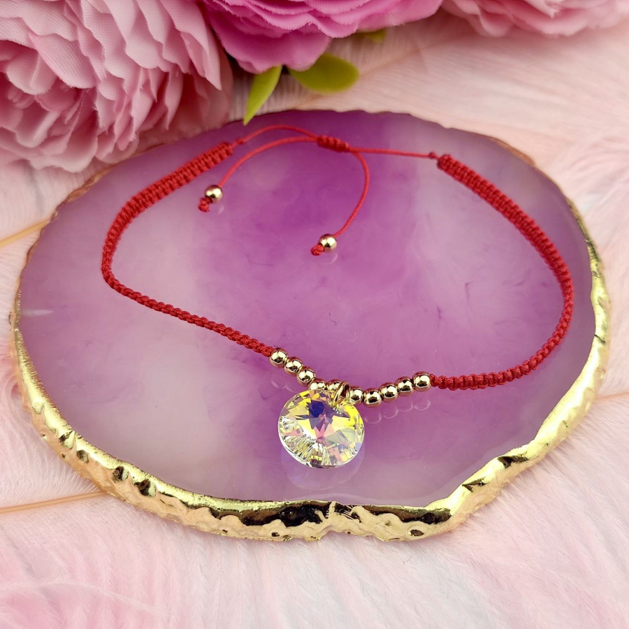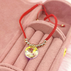 Biżuteria pozłacana, trzykrotnie pokryta warstwą 18-karatowego złota. Bransoletka na czerwonym sznurku, z kryształem Swarovskiego w kolorze multi. Zaciskana, dzięki czemu idealnie dopasowuje się do obwodu nadgarstka.