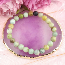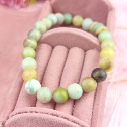 Bransoletka na gumce, dzięki czemu idealnie dopasowuje się do odwodu nadgarstka. Wykonana z kamieni naturalnych, mineralnych, w odcieniach pastelowych. Mix kamieni.