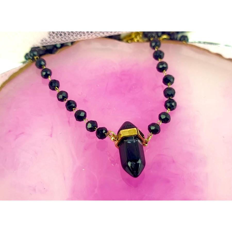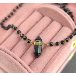 Biżuteria wykonana jest z najwyższej jakości stali chirurgicznej 316, która nie czernieje, nie uczula i jest w 100% hipoalergiczna. Bransoletka z kamieniem naturalnym - turmalinem i czarnymi, szlifowanymi paciorkami Długość 16 cm + 4 cm przedłużka.