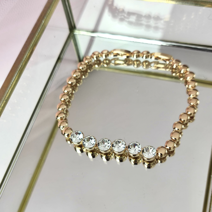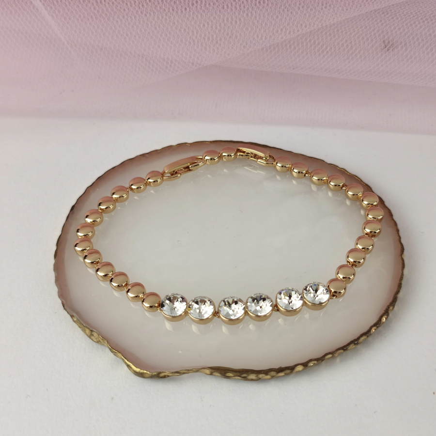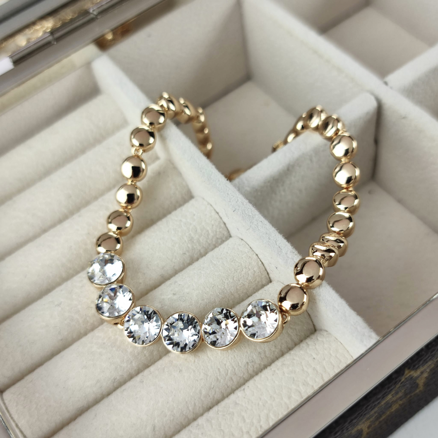 Bransoletka wysadzana kryształami w kolorze srebrnym/białym. Długość bransoletki jest regulowana, możliwe długości to 19 cm lub 21,5 cm.