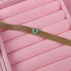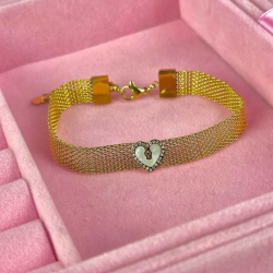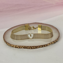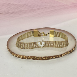 Bransoletka siatkowa wykonana z najwyższej jakości stali chirurgicznej 316L. Ozdobiona sercem wykonanym z białej masy i wysadzanym naokoło cyrkoniami. Długość 17,5 + 5 cm przedłużka.