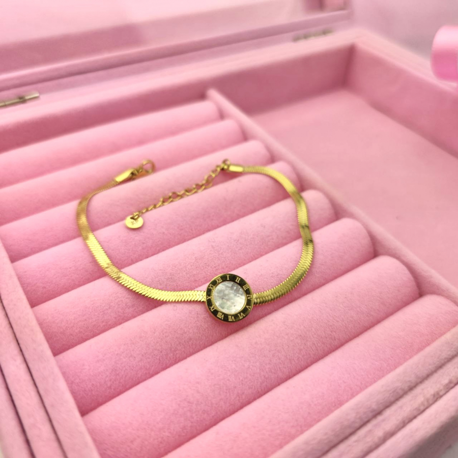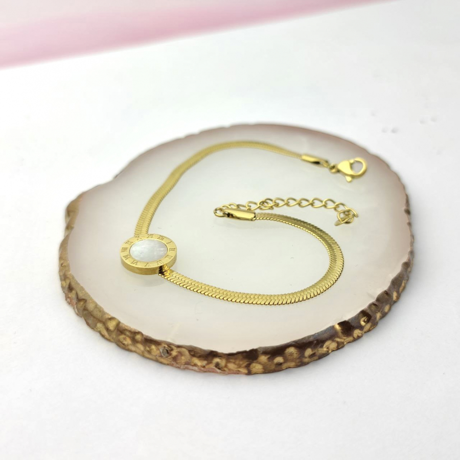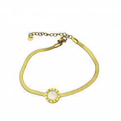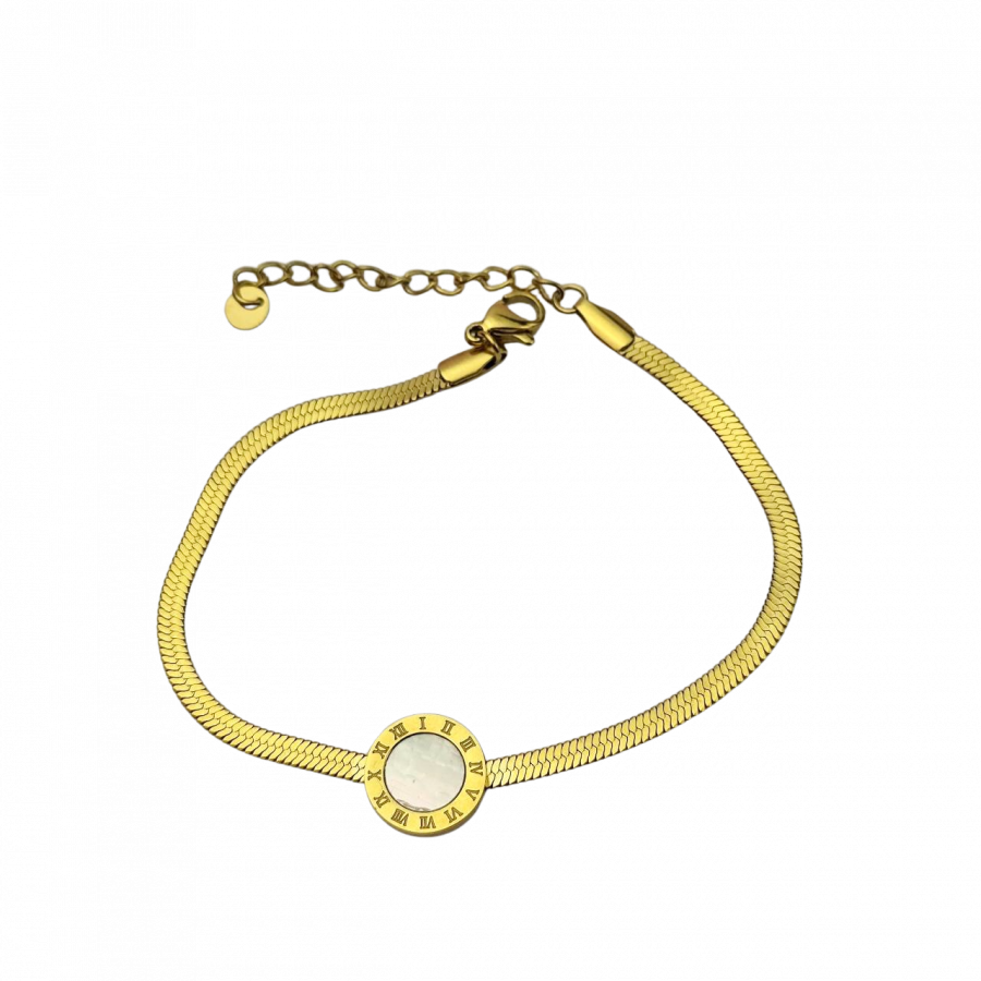 Biżuteria wykonana jest z najwyższej jakości stali chirurgicznej 316, która nie czernieje, nie uczula i jest w 100% hipoalergiczna. Bransoletka żmijka płaska z centralnie położonym kołem z białej masy perłowej, ozdobionym naokoło grawerowanymi rzymskimi cyframi. Długość 18 cm + 4 cm przedłużka.
