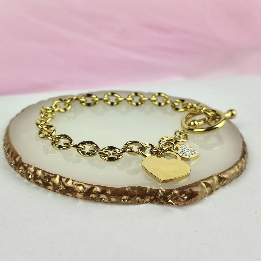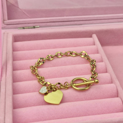 Biżuteria wykonana jest z najwyższej jakości stali chirurgicznej 316, która nie czernieje, nie uczula i jest w 100% hipoalergiczna. Bransoletka o zapięciu typu patyk, z zawieszkami w postaci serduszek. Długość 19,5 cm.