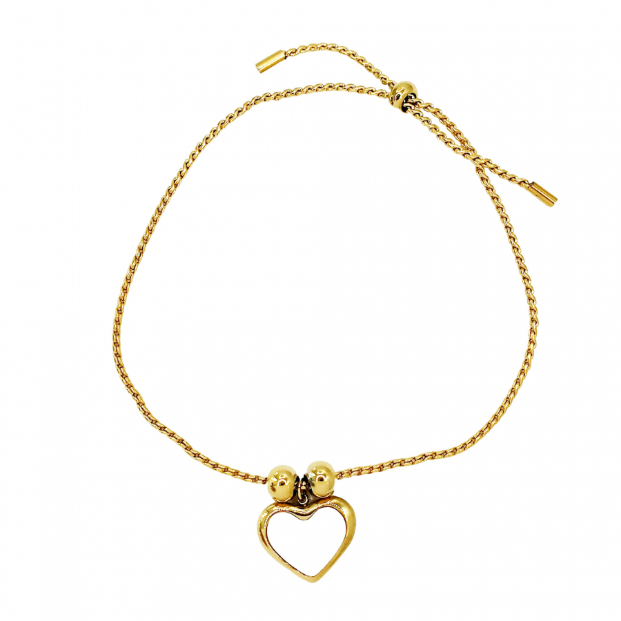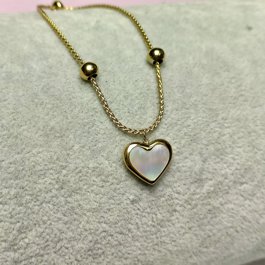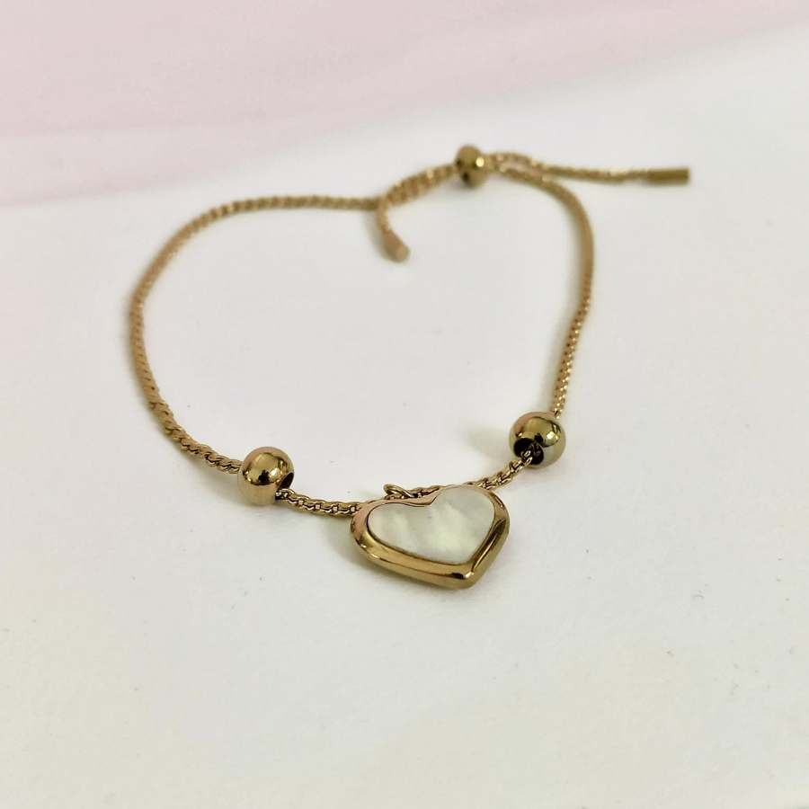 Bransoletka zaciskana wykonana ze stali chirurgicznej, dopasuje się na każdy obwód ręki, zarówno mały jak i duży. Z motywem serca, z dodatkiem masy perłowej.