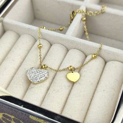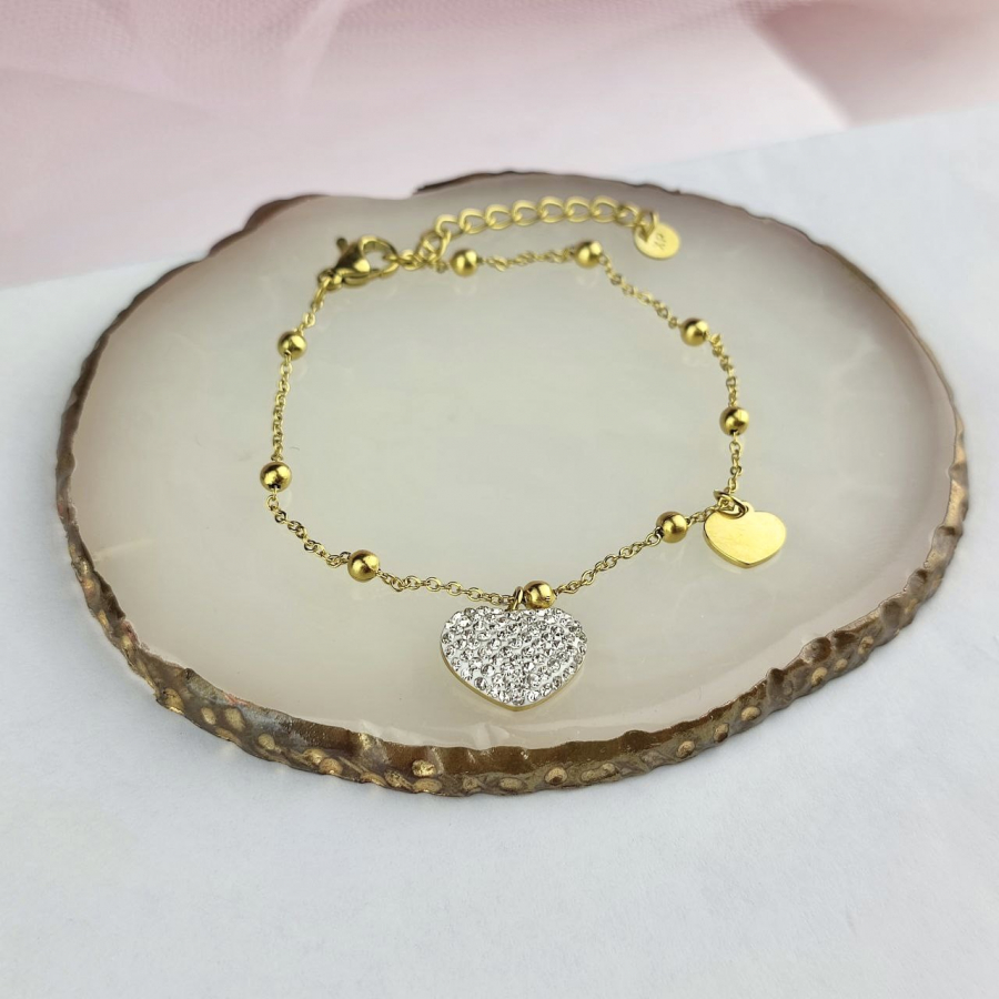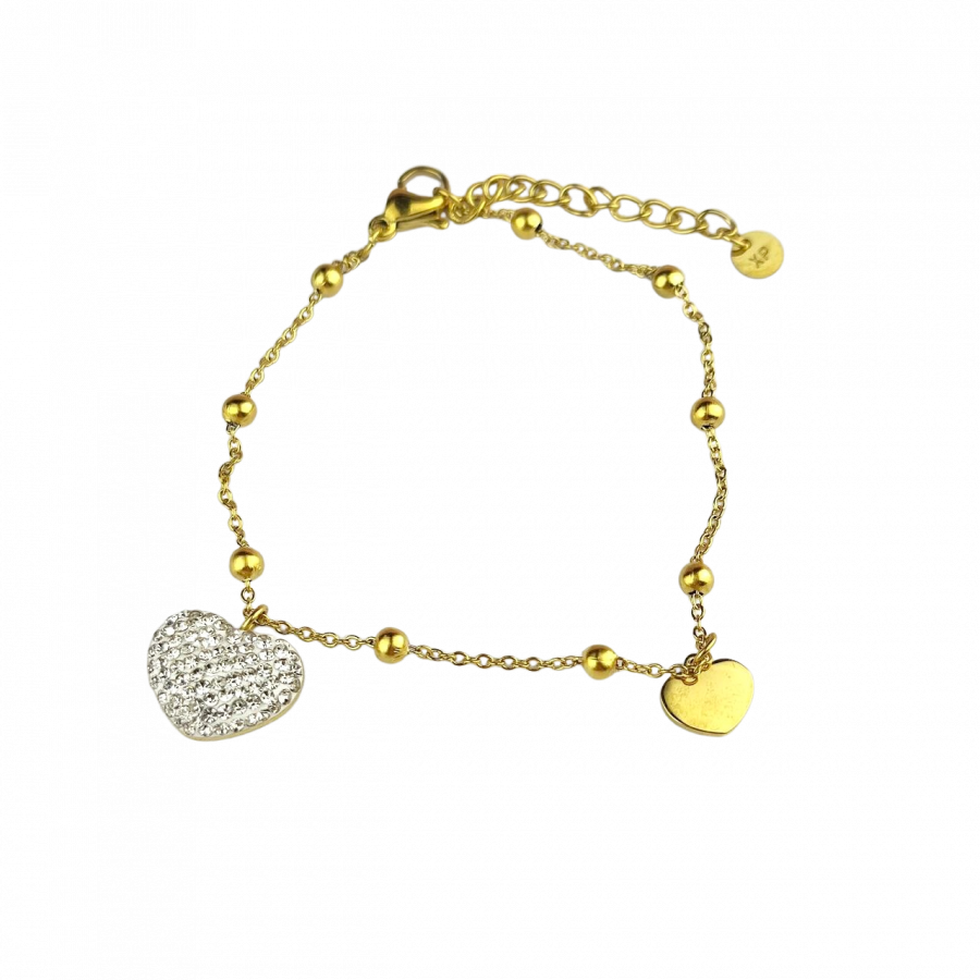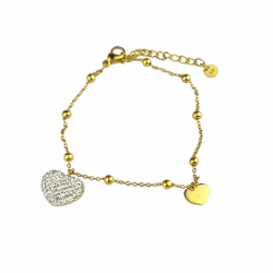 Biżuteria wykonana jest z najwyższej jakości stali chirurgicznej 316, która nie czernieje, nie uczula i jest w 100% hipoalergiczna. Bransoletka z drobnymi kuleczkami i dwoma zawieszkami w kształcie serca, jedno wysadzane w cyrkonie. Długość 17 cm + 4 cm przedłużka.