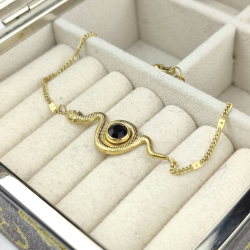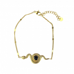 Biżuteria wykonana jest z najwyższej jakości stali chirurgicznej 316, która nie czernieje, nie uczula i jest w 100% hipoalergiczna. Bransoletka z łańcuszkiem spłaszczanym, ze żmiją i czarnym kryształem. Długość bransoletki 18 cm + 4 cm przedłużka.