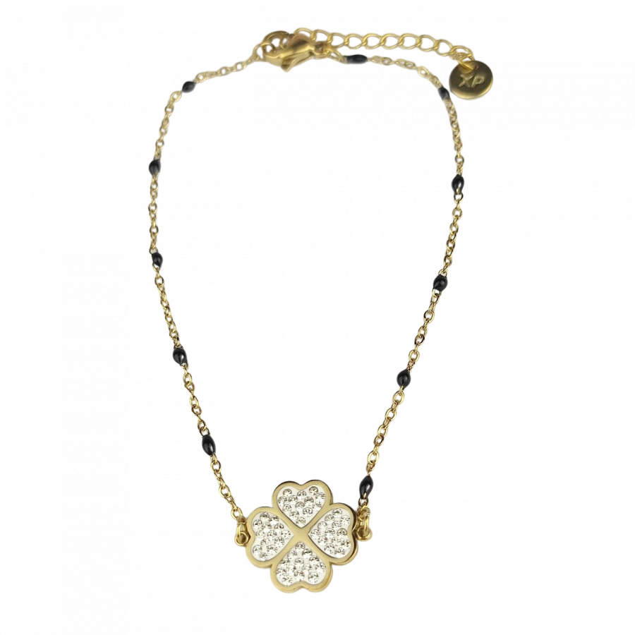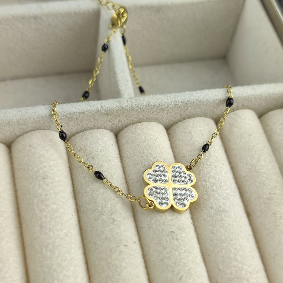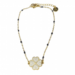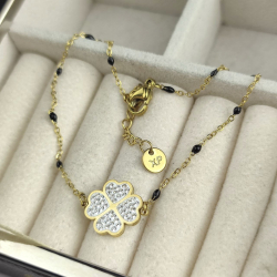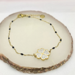 Bransoletka paciorki czarne koniczynka cyrkonie stal chirurgiczna