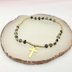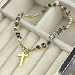 Biżuteria wykonana jest z najwyższej jakości stali chirurgicznej 316, która nie czernieje, nie uczula i jest w 100% hipoalergiczna. Bransoletka na gumce, z czarnymi paciorkami i złotymi kuleczkami, z krzyżem. Idealnie dopasowuje się do obwodu nadgarstka. Cenionej marki Blueberry.