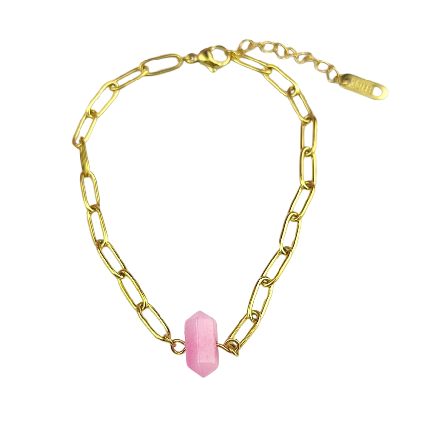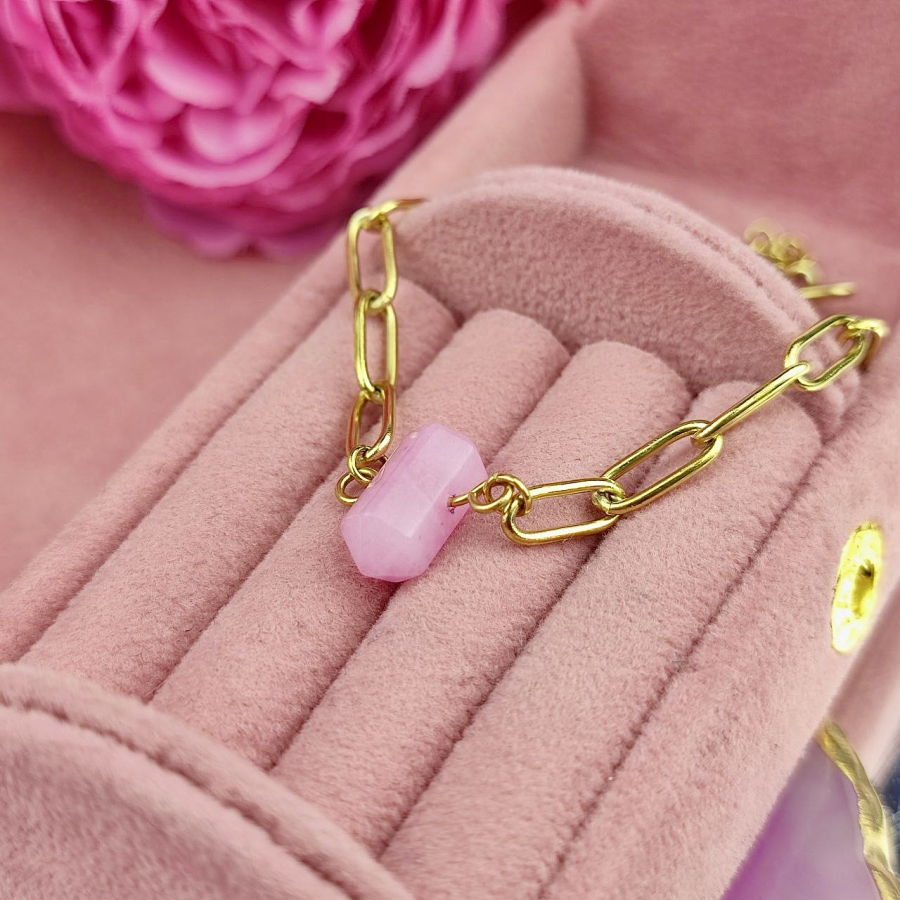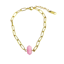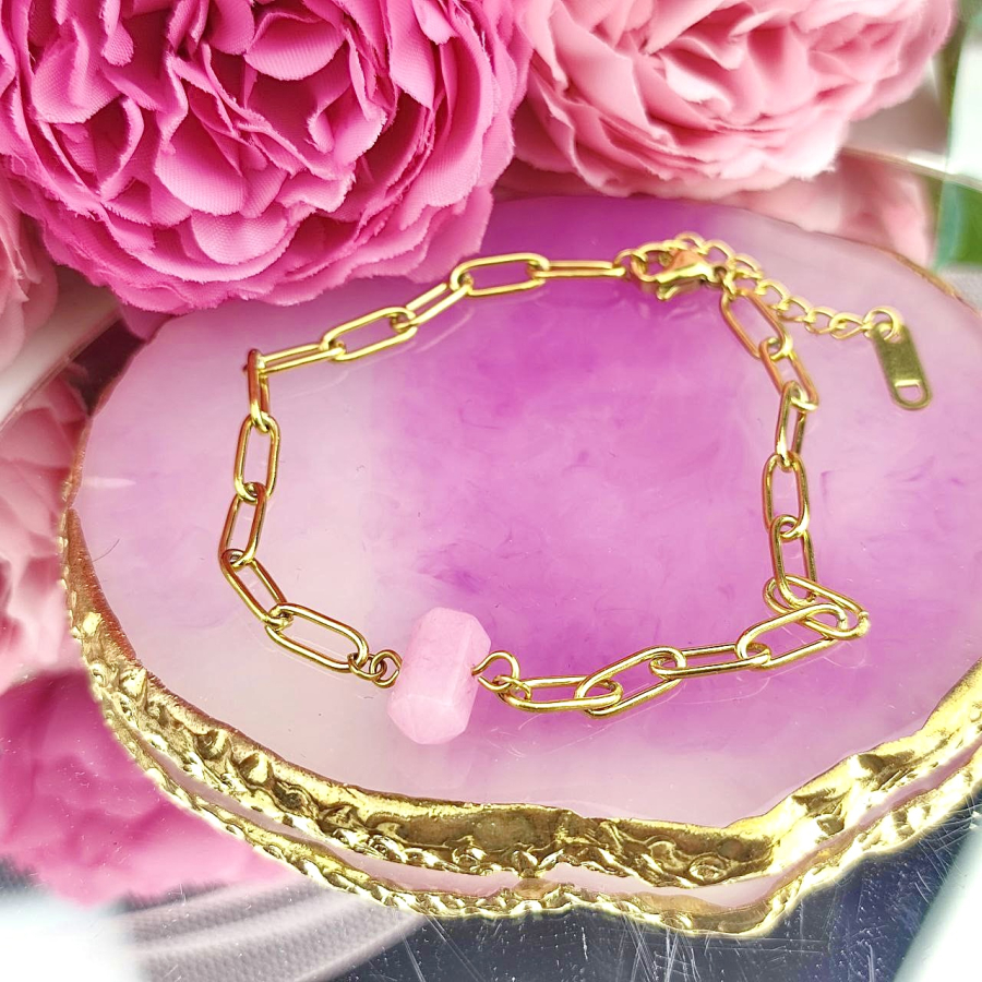 Biżuteria wykonana jest z najwyższej jakości stali chirurgicznej 316, która nie czernieje, nie uczula i jest w 100% hipoalergiczna. Bransoletka z kamieniem naturalnym - kwarcem różowym. Długość 19 cm + 4 cm przedłużka. Możliwość zrobienia krótszej długości.
