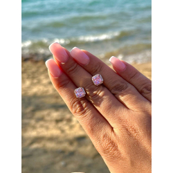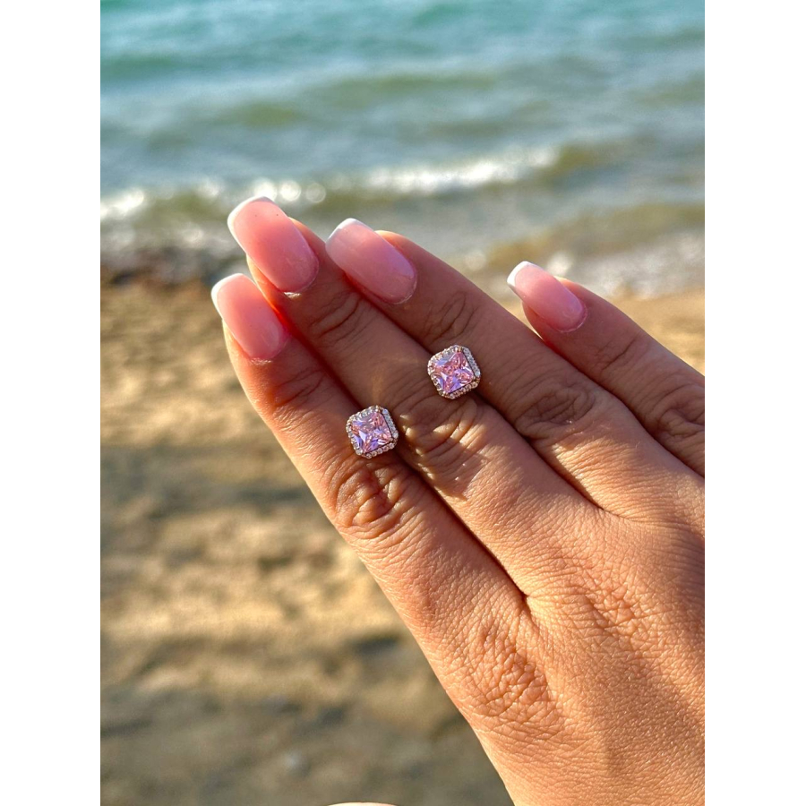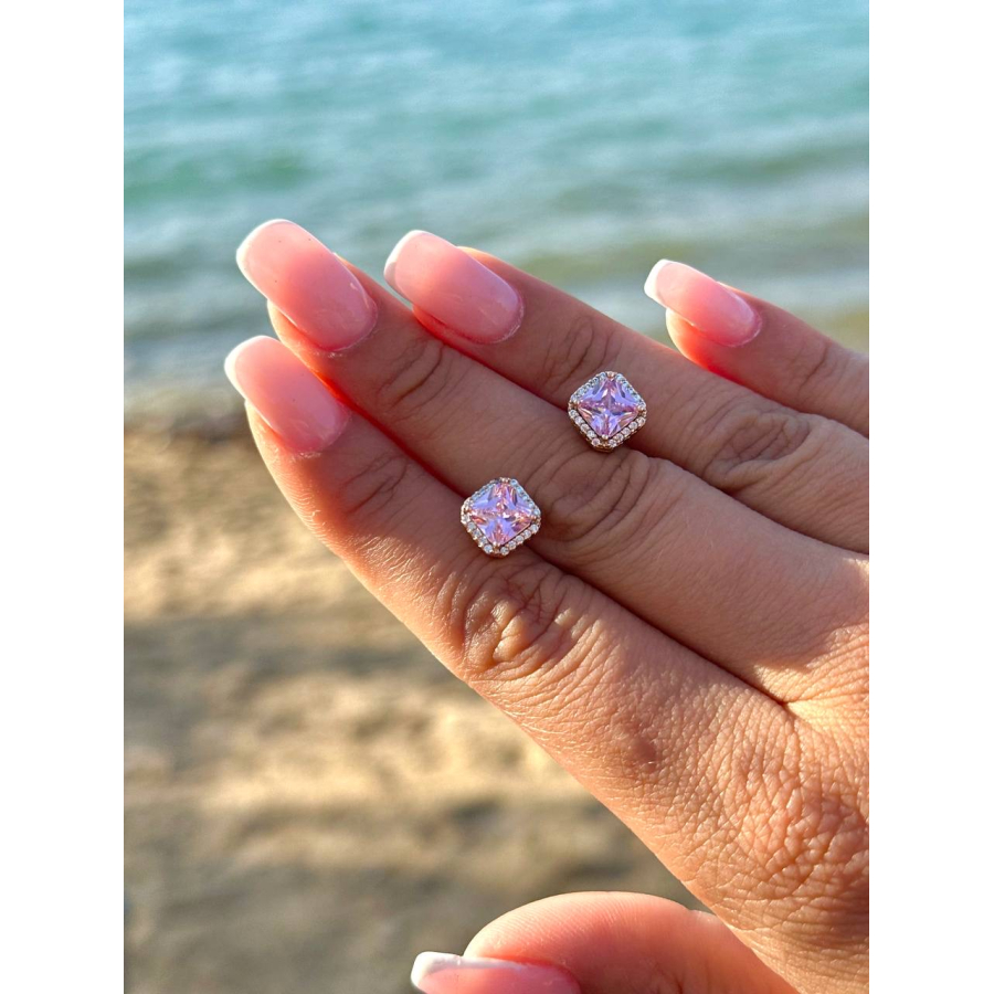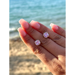 Biżuteria pozłacana, trzykrotnie pokryta warstwą 18-karatowego złota. Kolczyki typu sztyfty/wkręty w kształcie kwadratu, wzór markiz - centralnie położony duży kryształ w kolorze różowym, wokół niego osadzone drobne kryształki w kolorze srebrnym. Wielkość 7 mm.