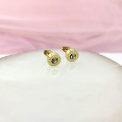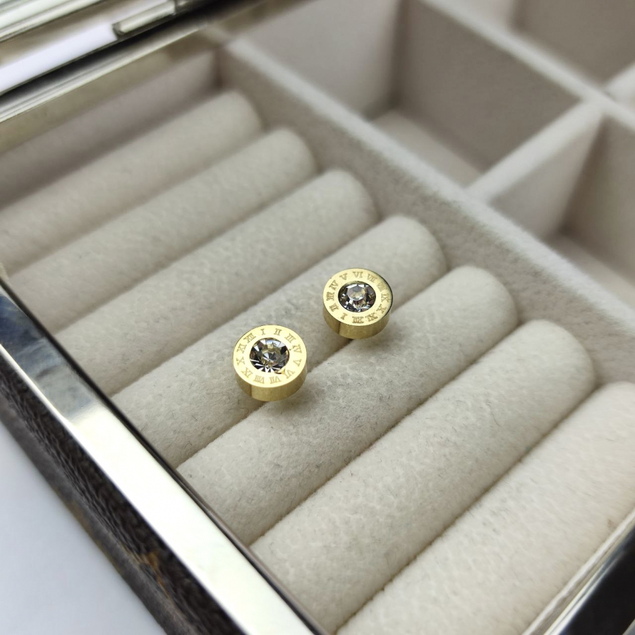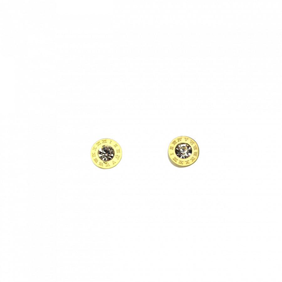 Drobne kolczyki typu sztyfty/wkręty wykonane z najwyższej jakości stali chirurgicznej 316L, która jest w 100% hipoalergiczna. Idealna biżuteria na co dzień. Ozdobione centralnie położony kryształem, otoczonym grawerowanymi rzymskimi cyframi. Średnica 8 mm.