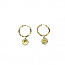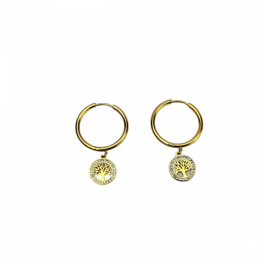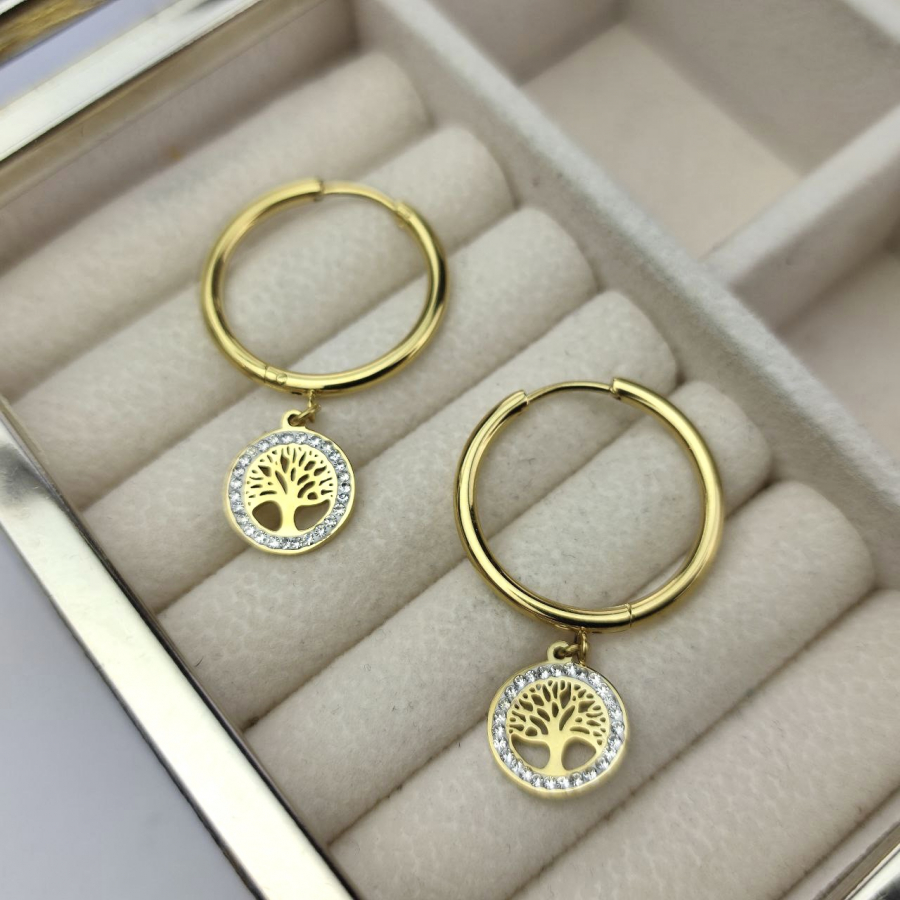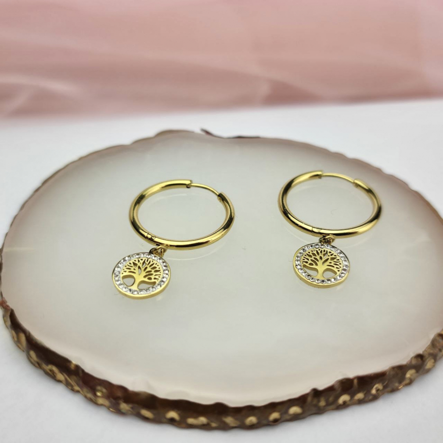 Biżuteria wykonana jest z najwyższej jakości stali chirurgicznej 316, która nie czernieje, nie uczula i jest w 100% hipoalergiczna. Marka Blueberry. Kolczyki na kółko z francuskim zapięciem, z drzewkiem szczęścia ozdobionym cyrkonami. Średnica koła 2cm, wielkość zawieszki 1 cm.