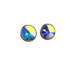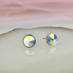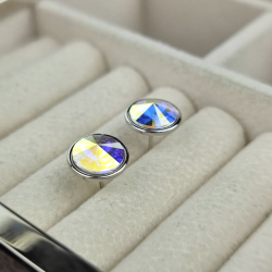 Biżuteria rodowana, trzykrotnie pokryta warstwą srebra. Kolczyki typu sztyfty/wkręty, z kryształem w kolorze AB, czyli multi. Średnica 1cm.