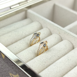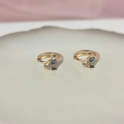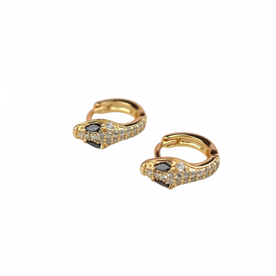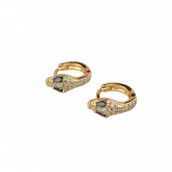 Biżuteria pozłacana, trzykrotnie pokryta warstwą 18-karatowego złota. Kolczyki na francuskim zapięciu, drobne kółka, ze żmiją, bogato ozdobione cyrkoniami, z czarnymi oczami. Średnica 1 cm.