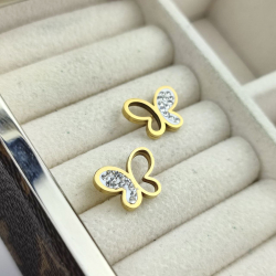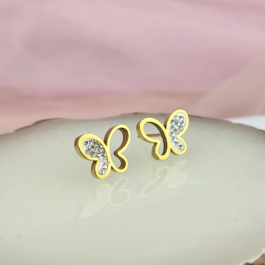 Biżuteria wykonana jest z najwyższej jakości stali chirurgicznej 316, która nie czernieje, nie uczula i jest w 100% hipoalergiczna. Kolczyki typu sztyfty/ wkręty w kształcie motyla, ozdobione z jednej strony cyrkoniami. Wysokość 1cm, szerokość 1,3 cm.