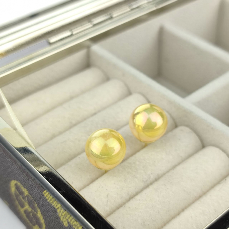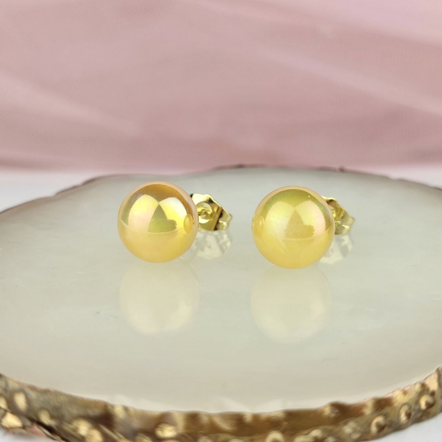 Biżuteria wykonana jest z najwyższej jakości stali chirurgicznej 316, która nie czernieje, nie uczula i jest w 100% hipoalergiczna. Kolczyki typu sztyfty/wkręty z opalizującą perełką w złotym kolorze. Średnica perły 1 cm.