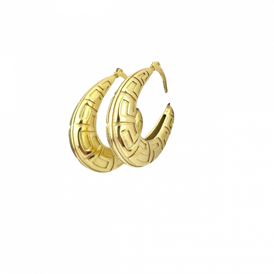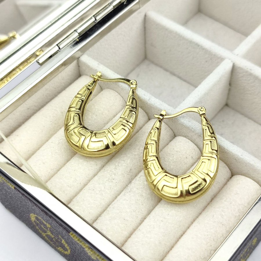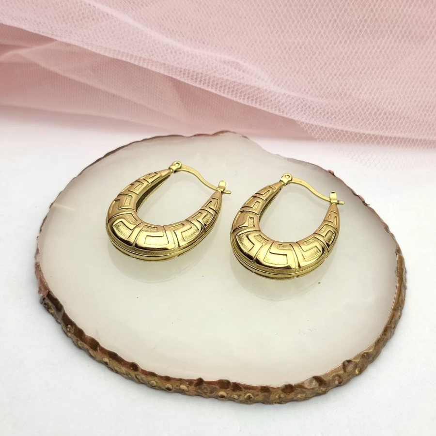 Biżuteria wykonana jest z najwyższej jakości stali chirurgicznej 316, która nie czernieje, nie uczula i jest w 100% hipoalergiczna. Kolczyki z drogą grecką, w owalnym kształcie. Wielkość 3,5 cm.