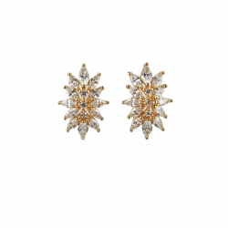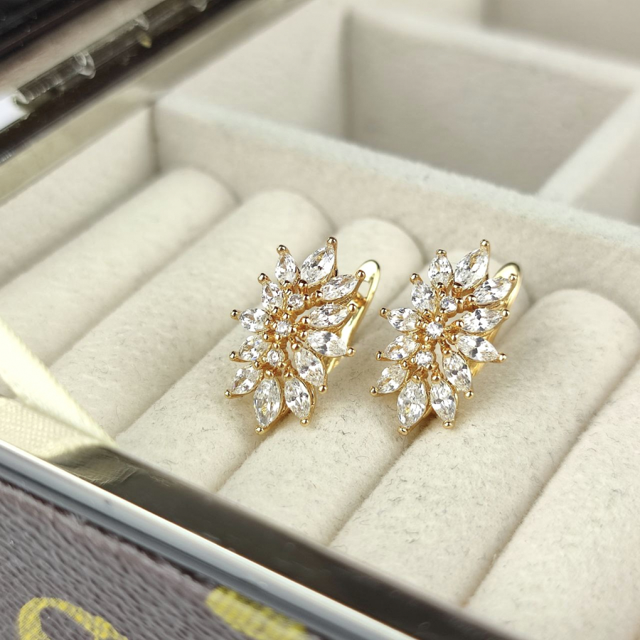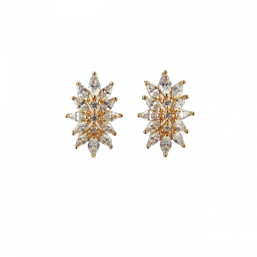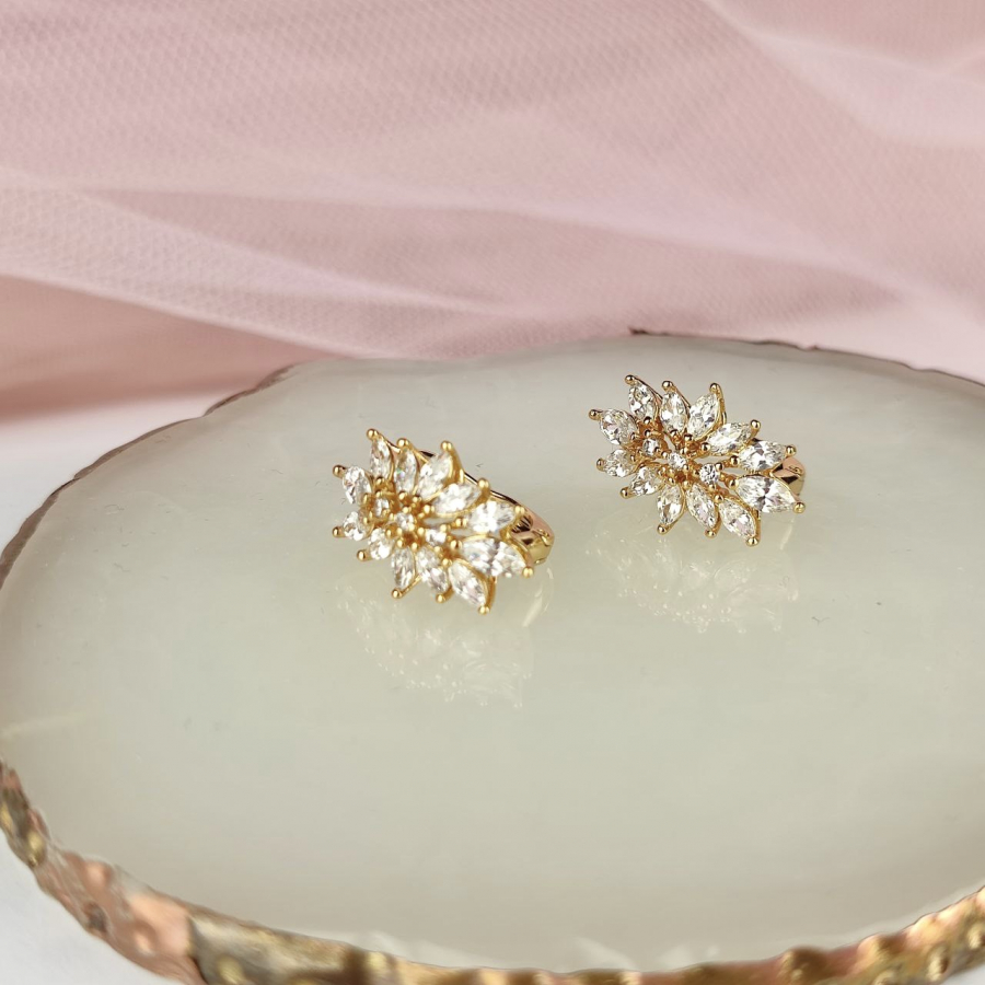 Biżuteria pozłacana, trzykrotnie pokryta warstwą 18-karatowego złota. Kolczyki na angielskim zapięciu, bogato wysadzane kryształkami w kolorze srebrnym. Wielkość 1,8 cm.