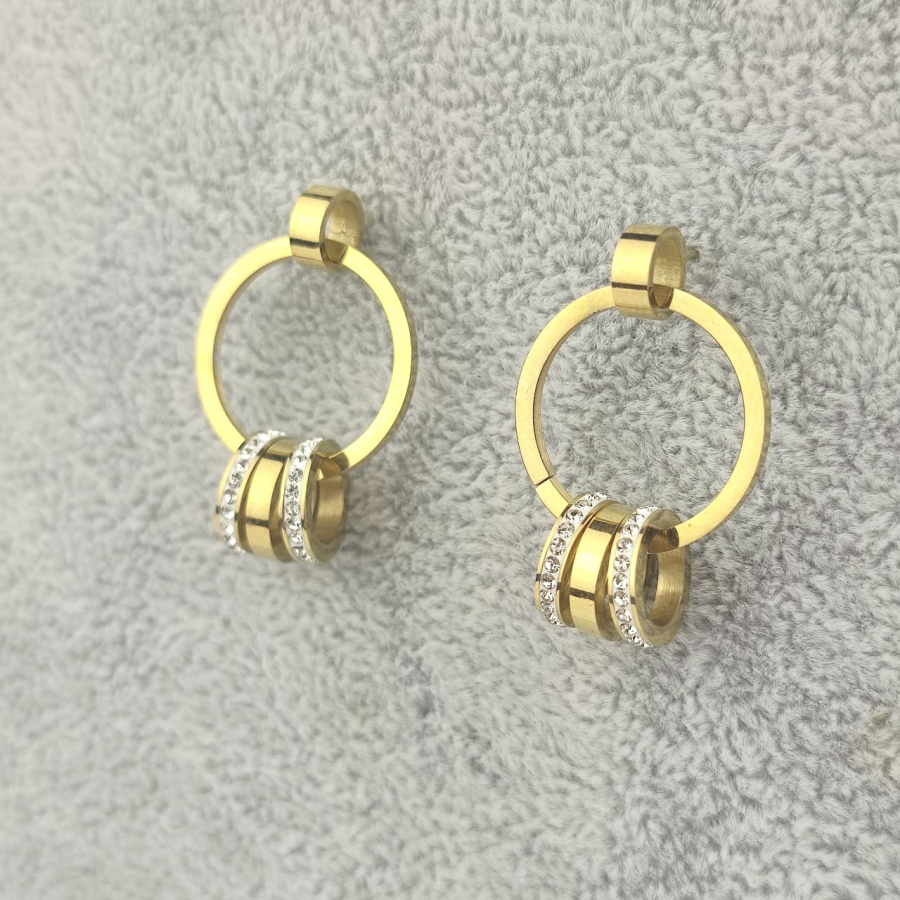 Biżuteria wykonana jest z najwyższej jakości stali chirurgicznej 316, która nie czernieje, nie uczula i jest w 100% hipoalergiczna. Kolczyki typu sztyfty/wkręty, z kółkiem i zaczepionymi na nim oczkami - dwoma z cyrkoniami i jednym gładkim złotym. Wielkość 3 cm.
