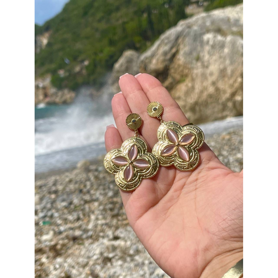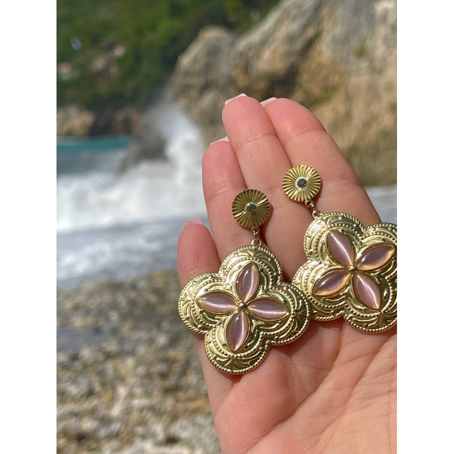 Biżuteria wykonana jest z najwyższej jakości stali chirurgicznej 316, która nie czernieje, nie uczula i jest w 100% hipoalergiczna.  Kolczyki typu sztyfty/wkręty, w kształcie koniczynki, z różowym kamieniem. Cenionej marki Moonriver. Wielkość 6 cm.