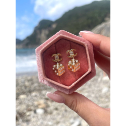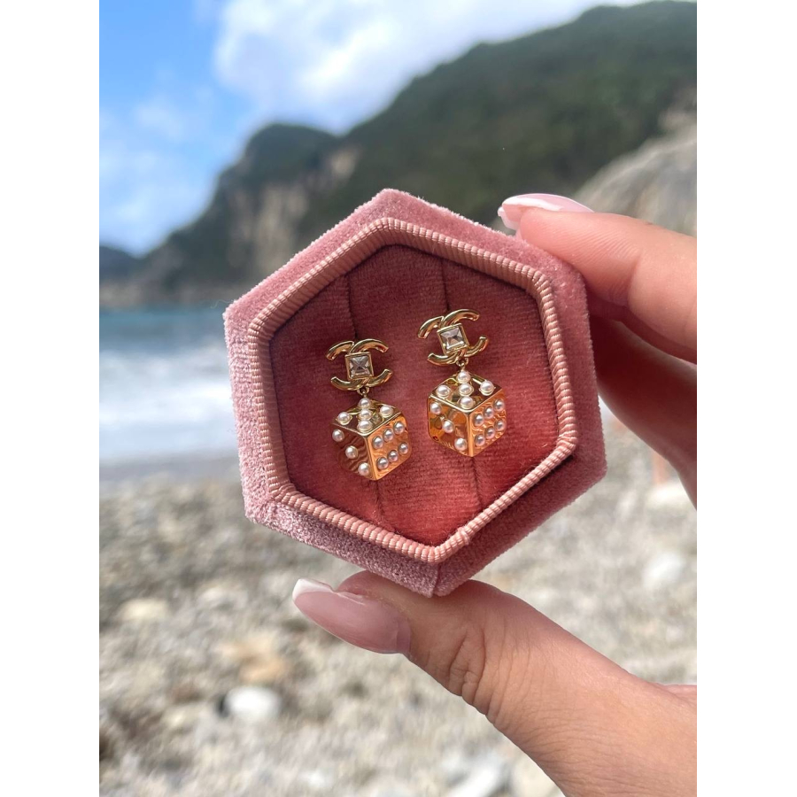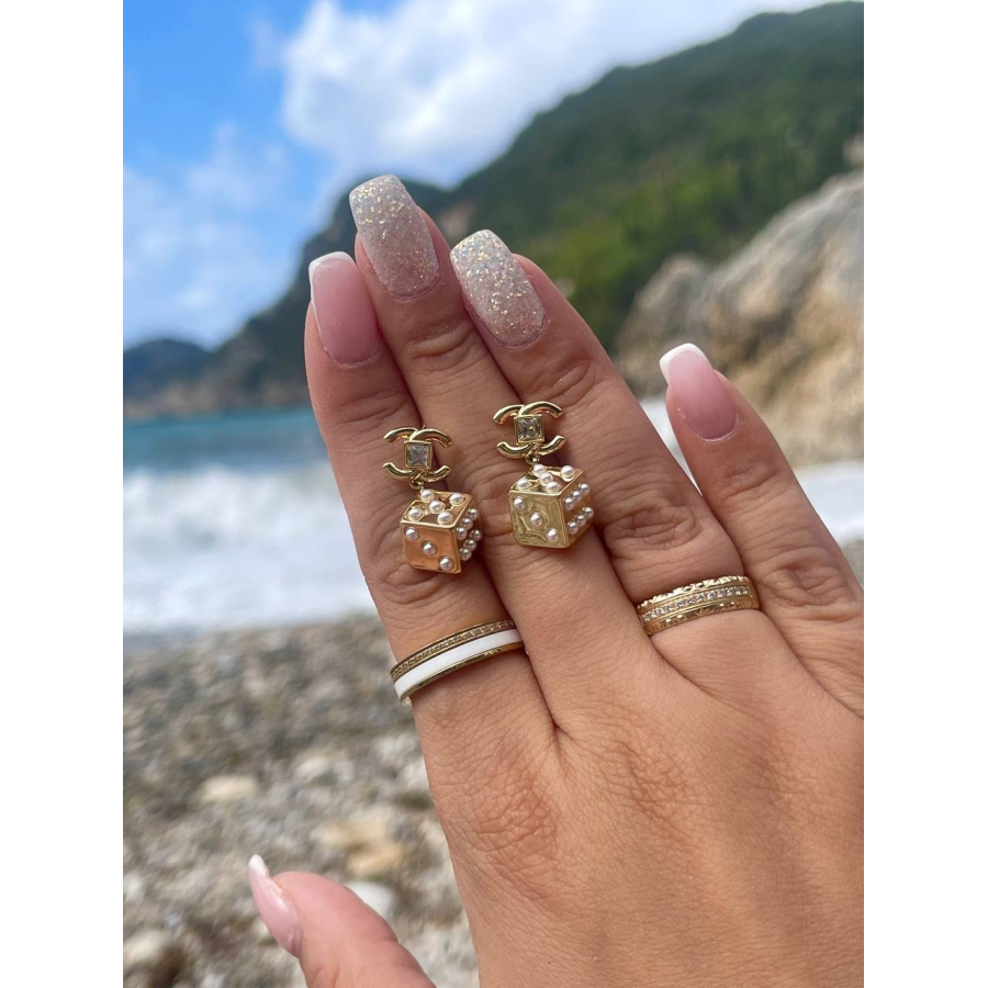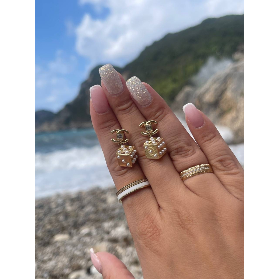 Biżuteria wykonana jest z najwyższej jakości stali chirurgicznej 316, która nie czernieje, nie uczula i jest w 100% hipoalergiczna. Kolczyki typu sztyfty/wkręty, z kostką ozdobioną perełkami. Cenionej marki Moonriver. Kolor złota próby 585. Wielkość 2,5 cm.