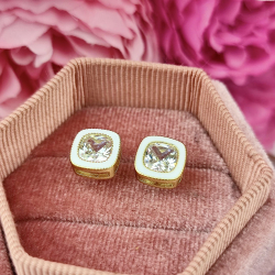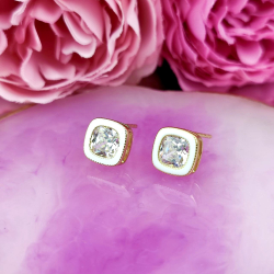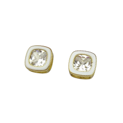 Biżuteria pozłacana, trzykrotnie pokryta warstwą 18-karatowego złota. Kolczyki typu sztyfty/wkręty ze srebrnym kryształem, otoczone białą obwódką. Wielkość 9 mm.