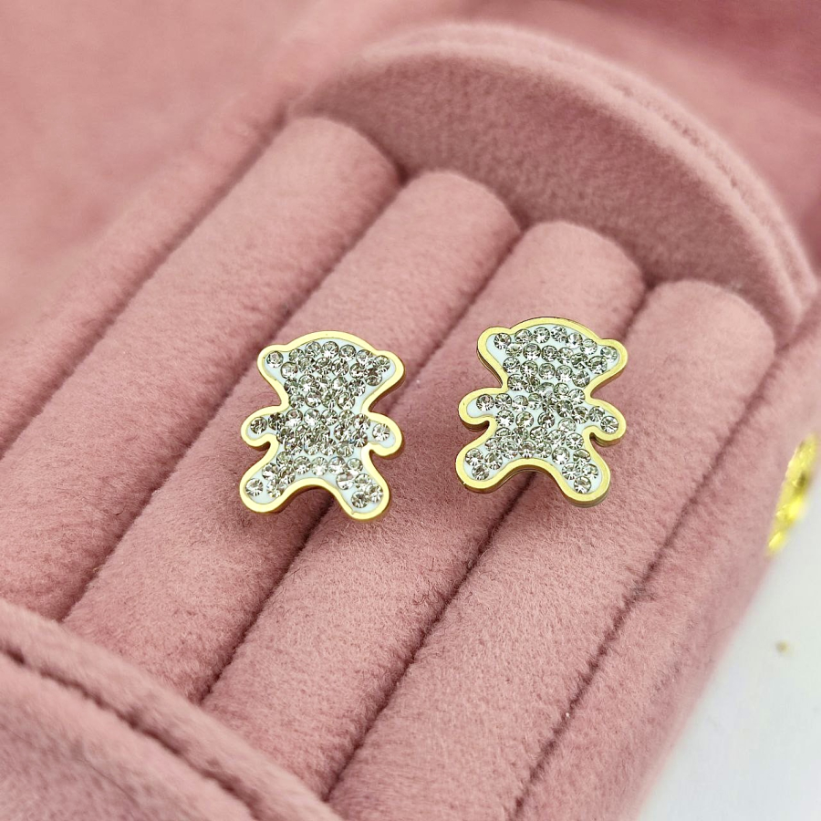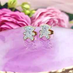 Biżuteria wykonana jest z najwyższej jakości stali chirurgicznej 316, która nie czernieje, nie uczula i jest w 100% hipoalergiczna. Kolczyki typu sztyfty/ wkręty w kształcie misia, bogato wysadzane cyrkoniami. Wielkość 11 mm.