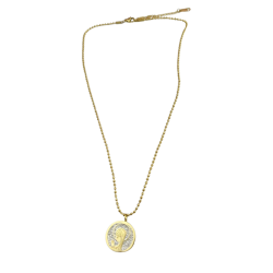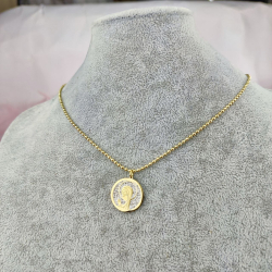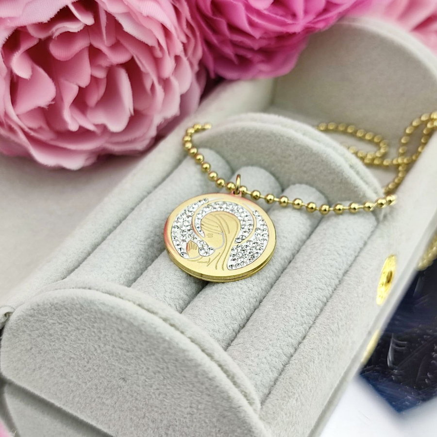 Biżuteria wykonana jest z najwyższej jakości stali chirurgicznej 316, która nie czernieje, nie uczula i jest w 100% hipoalergiczna. Naszyjnik na kuleczkowym łańcuszku, z okrągłym medalikiem z Maryją. Długość 46 cm + 6 cm przedłużka.