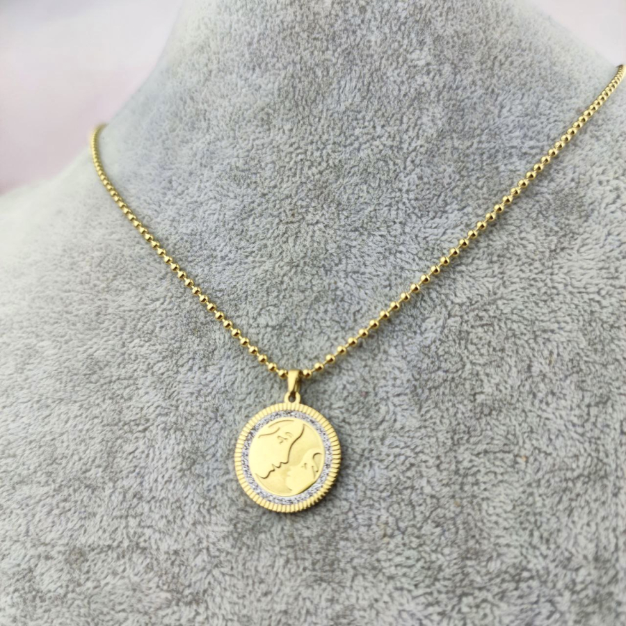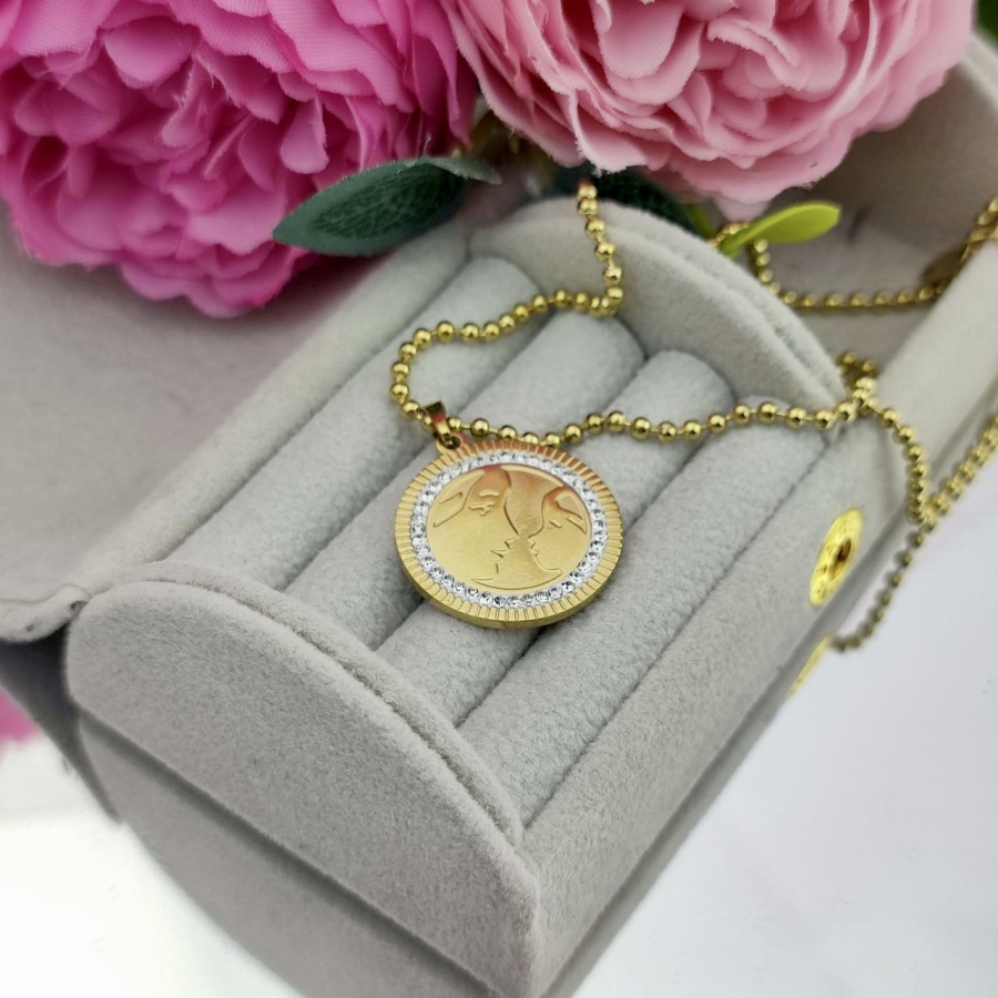 Biżuteria wykonana jest z najwyższej jakości stali chirurgicznej 316, która nie czernieje, nie uczula i jest w 100% hipoalergiczna. Naszyjnik na kuleczkowym łańcuszku, z okrągłą zawieszką, z mamą i dzieckiem. Długość 46 cm + 6 cm przedłużka.