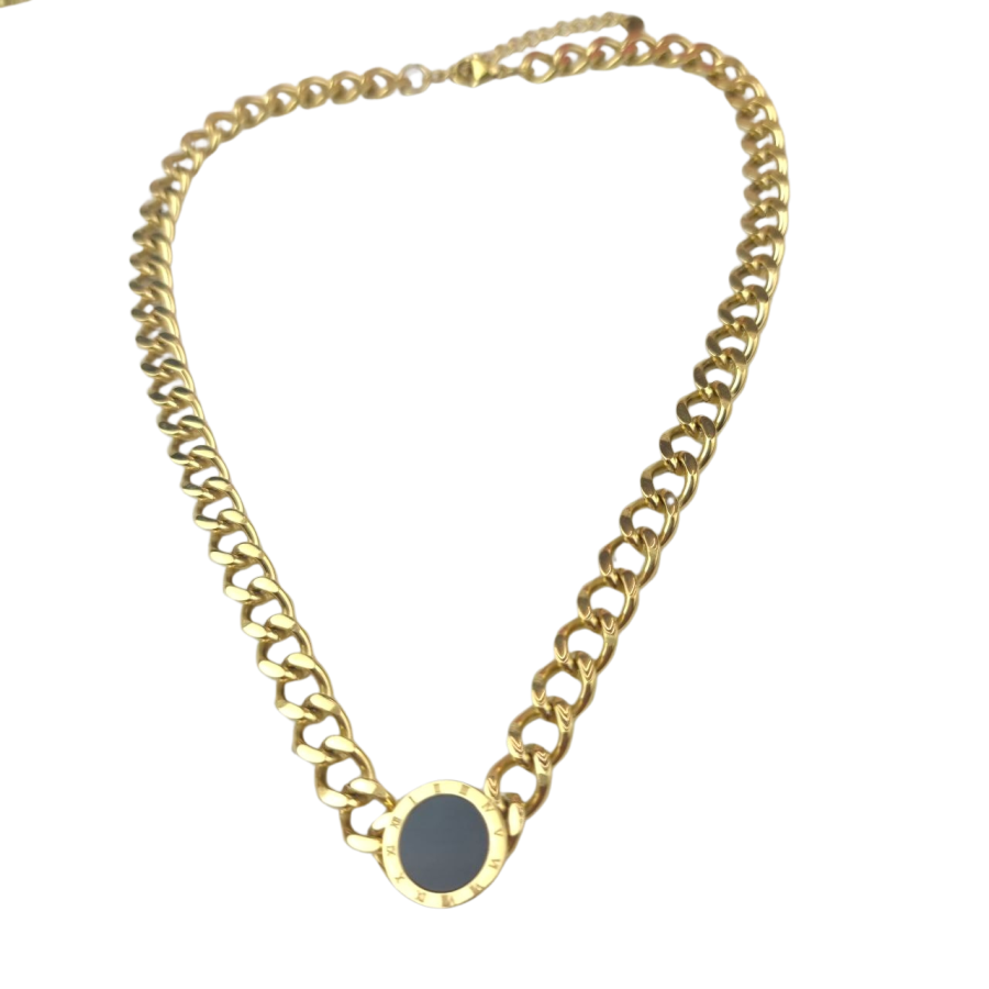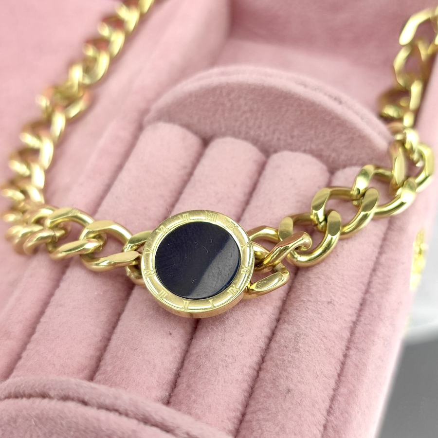 Biżuteria wykonana jest z najwyższej jakości stali chirurgicznej 316, która nie czernieje, nie uczula i jest w 100% hipoalergiczna. Naszyjnik gruby, typu pancerka, z czarny oczkiem i grawerowanymi rzymskimi cyframi wokół. Długość 42 cm + 5 cm przedłużka.