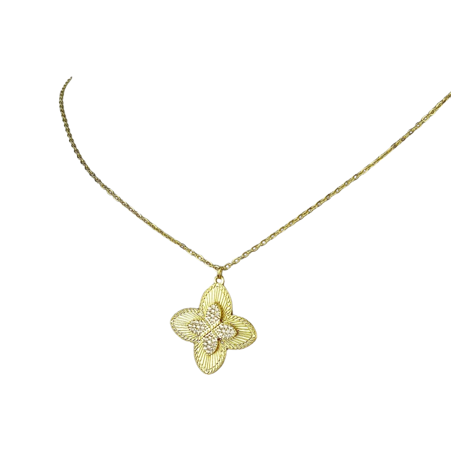 Biżuteria wykonana jest z najwyższej jakości stali chirurgicznej 316, która nie czernieje, nie uczula i jest w 100% hipoalergiczna. Naszyjnik z zawieszką w kształcie koniczynki, ozdobiony cyrkonami. Cenionej marki Blueberry. Długość 42 cm + 5 cm przedłużka.