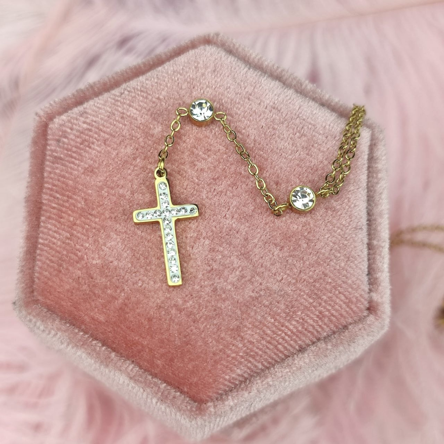 Biżuteria wykonana jest z najwyższej jakości stali chirurgicznej 316, która nie czernieje, nie uczula i jest w 100% hipoalergiczna. Naszyjnik typu krawatka, z krzyżem ozdobionym cyrkoniami. Długość 42 cm + 5 cm przedłużka.