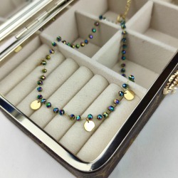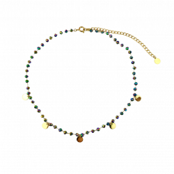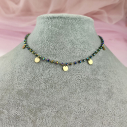 Naszyjnik typu choker, z paciorkami w kolorze holo oraz monetkami. Złote elementy wykonane ze stali chirurgicznej. Długość 32 cm + 10 cm przedłużka.