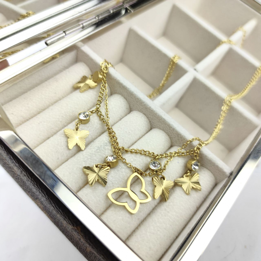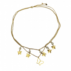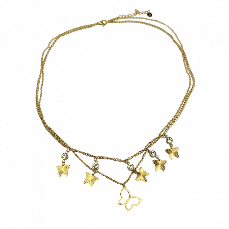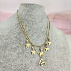 Naszyjnik podwójny wykonany ze stali chirurgicznej w kolorze złotym. Pierwszy naszyjnik jest grubszy, ozdobiony pięcioma motylami i kryształkami o długości 40 cm + 5 cm przedłużka. Drugi łańcuszek jest cieńszy, zakończony zawieszką w postaci konturu motyla ma długość 44 cm + 5 cm przedłużka.