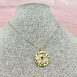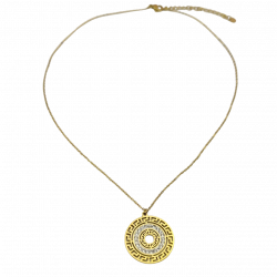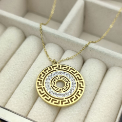 Biżuteria wykonana jest z najwyższej jakości stali chirurgicznej 316, która nie czernieje, nie uczula i jest w 100% hipoalergiczna. Naszyjnik typu celebrytka, z okrągłą zawieszką z drogą grecką, ozdobiona cyrkoniami. Długość naszyjnika 42 cm + 5 cm przedłużka, średnica zawieszki 2,5 cm.