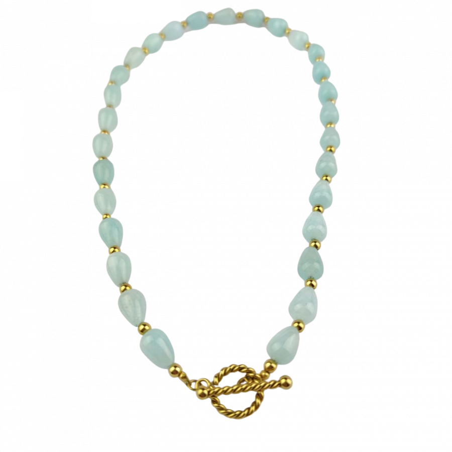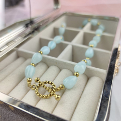 Biżuteria wykonana jest z najwyższej jakości stali chirurgicznej 316, która nie czernieje, nie uczula i jest w 100% hipoalergiczna. Naszyjnik z kamieniem naturalnym - akwamarynem, zapinany na patyk. Znanej i cenionej marki Moonriver. Długość 45 cm.