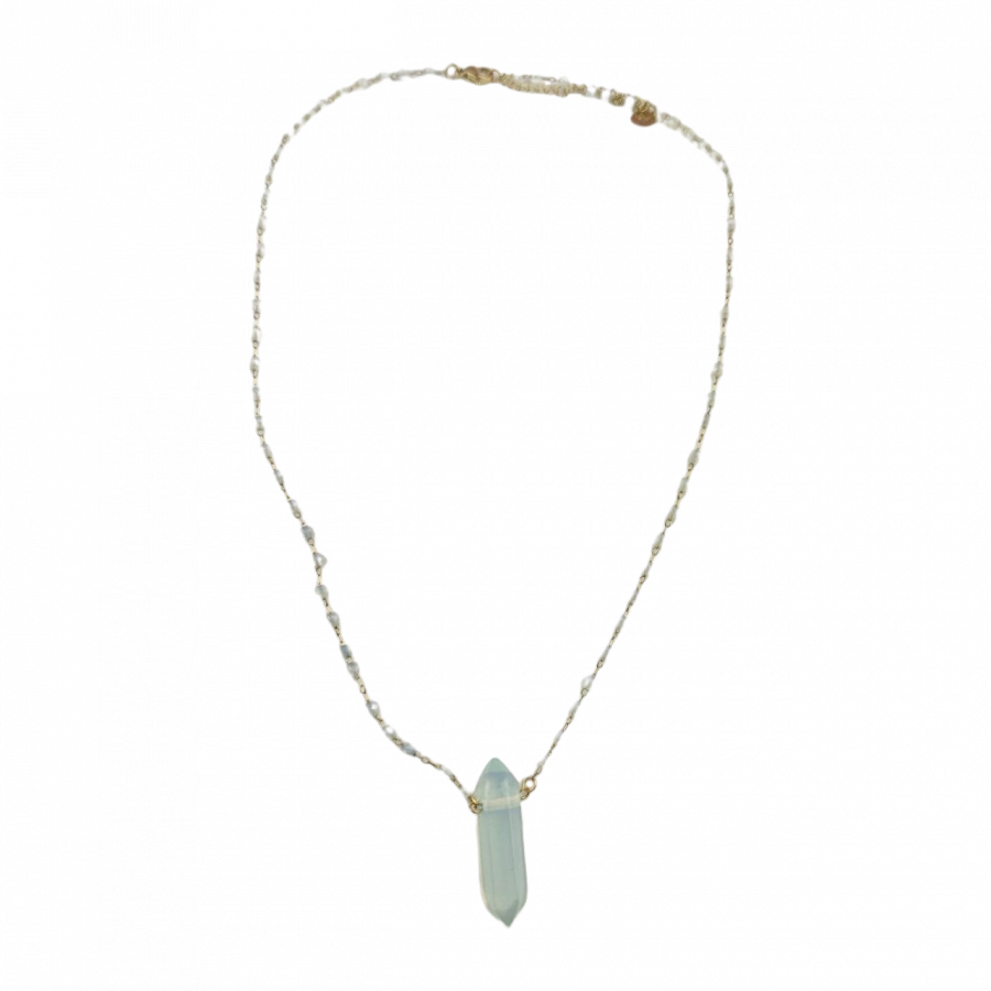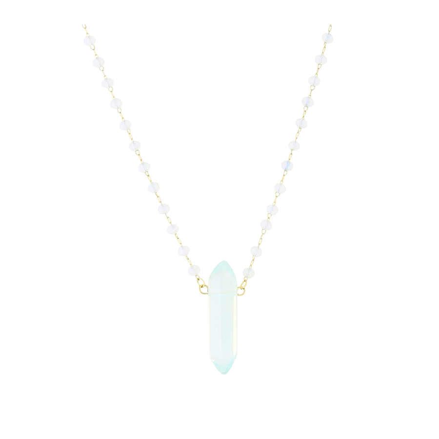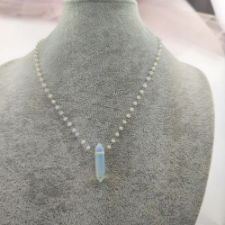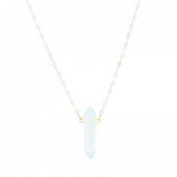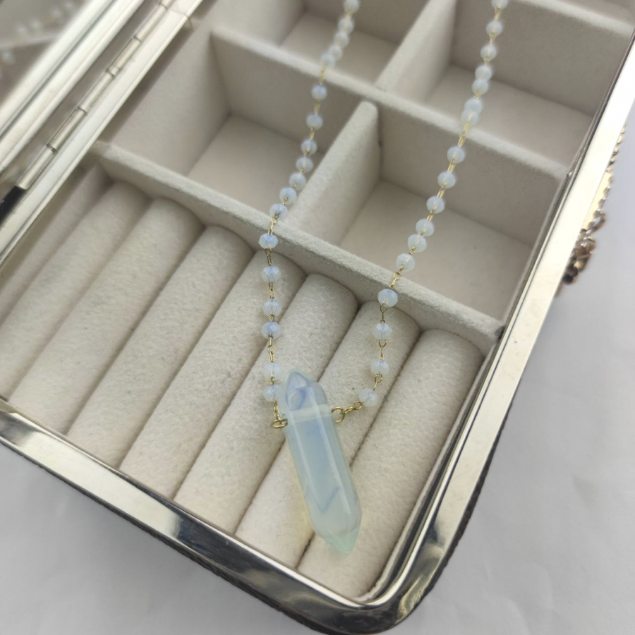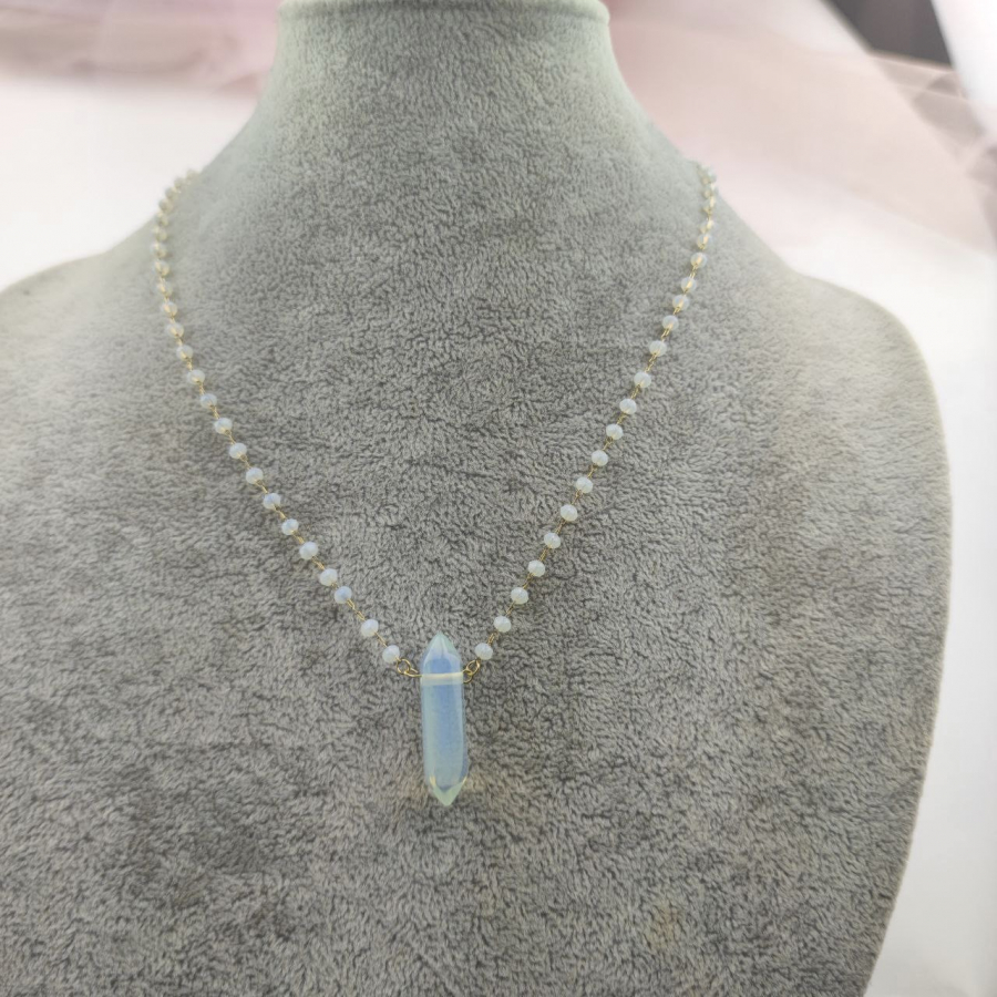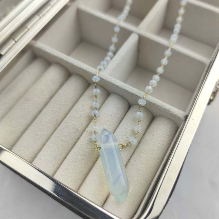 Biżuteria wykonana jest z najwyższej jakości stali chirurgicznej 316, która nie czernieje, nie uczula i jest w 100% hipoalergiczna. Naszyjnik z szlifowanymi paciorkami i minerałem - opalem. Długość 44 cm + 5 cm przedłużka.