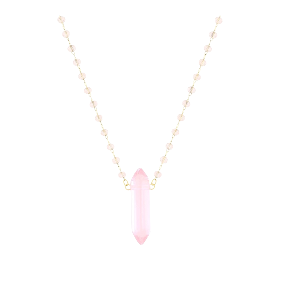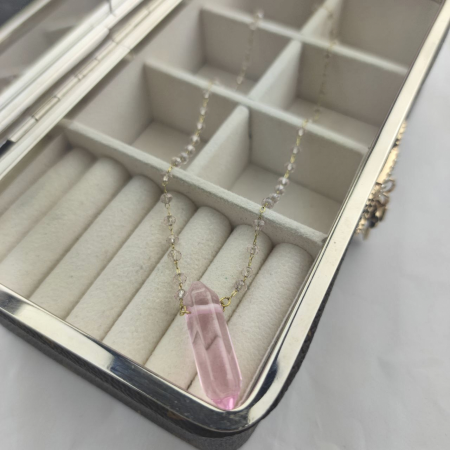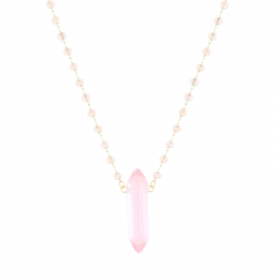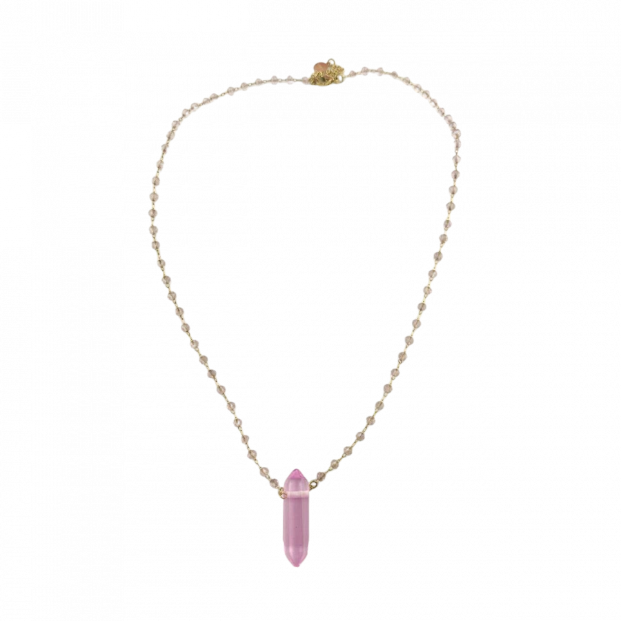 Biżuteria wykonana jest z najwyższej jakości stali chirurgicznej 316, która nie czernieje, nie uczula i jest w 100% hipoalergiczna. Naszyjnik z szlifowanymi paciorkami i minerałem - kryształem górskim barwionym na różowo. Długość 44 cm + 5 cm przedłużka.