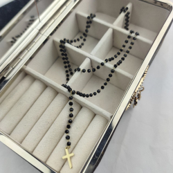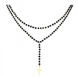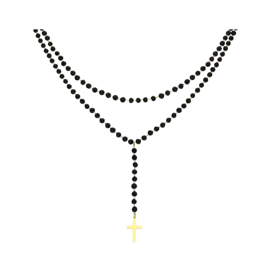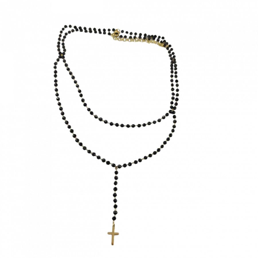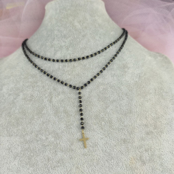 Biżuteria wykonana jest z najwyższej jakości stali chirurgicznej 316, która nie czernieje, nie uczula i jest w 100% hipoalergiczna. Naszyjnik typu różaniec, podwójny, w całości wykonany z czarnych paciorków. Zakończony złotym krzyżem. Długość krótszego łańcuszka 38 cm + 6 cm przedłużka, długość dłuższego 42 cm + 6 cm przedłużka.