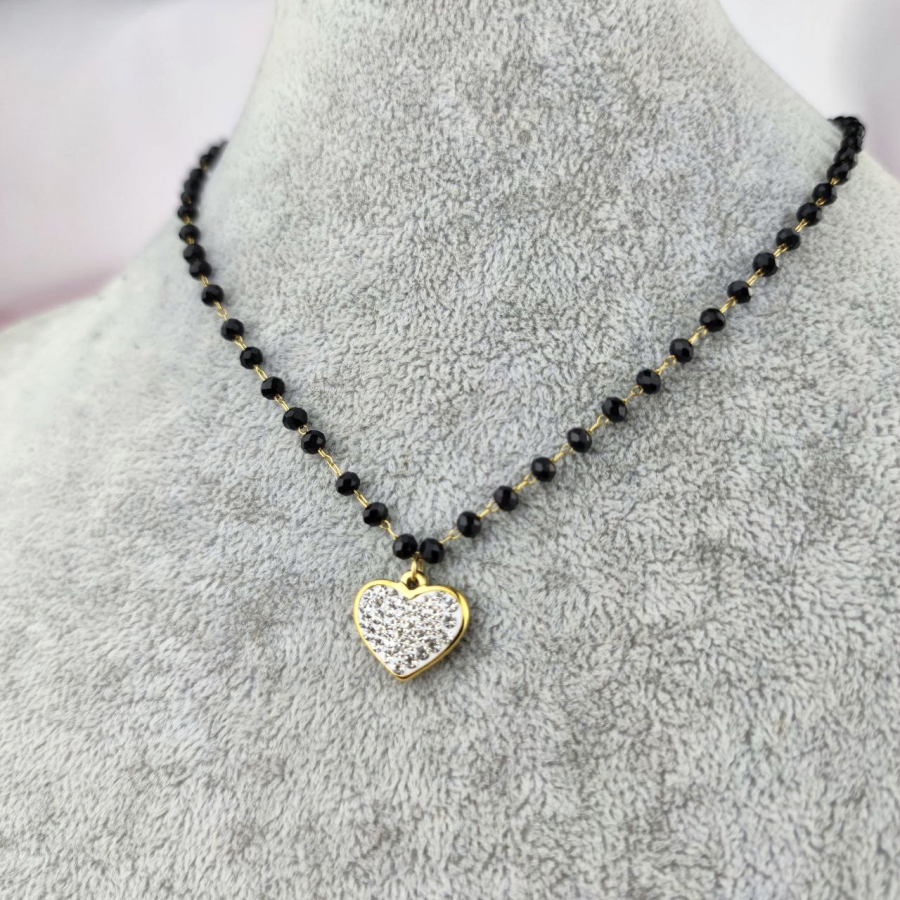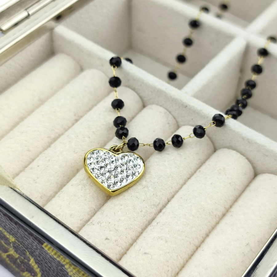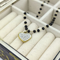 Naszyjnik czarne paciorki serce cyrkonie stal chirurgiczna