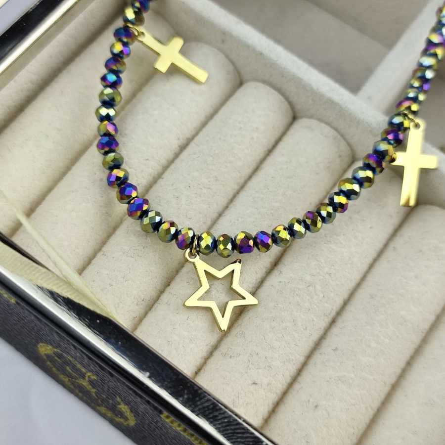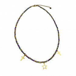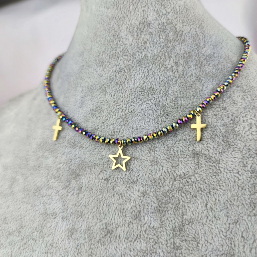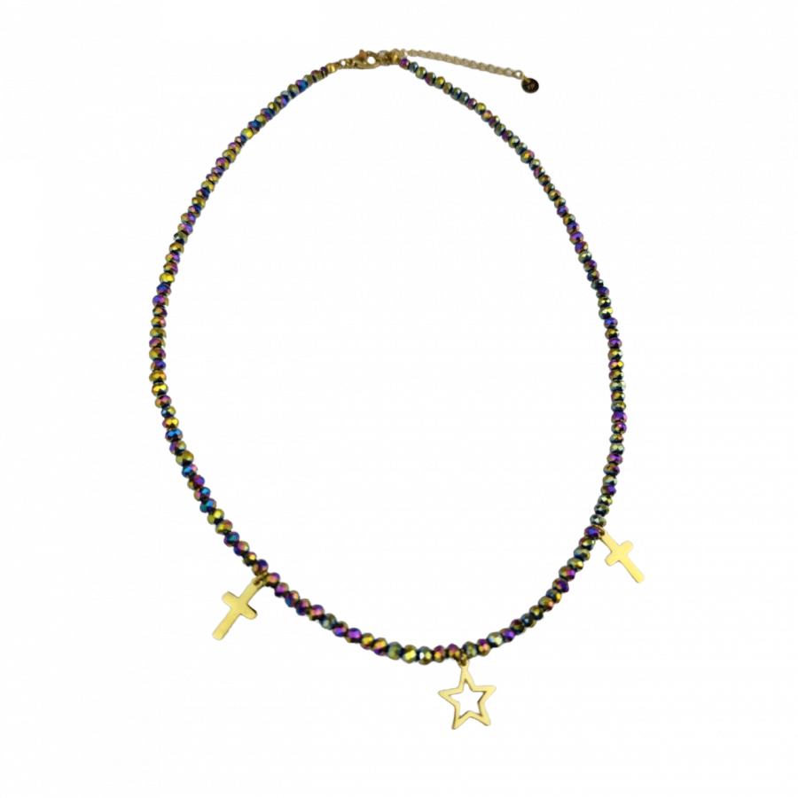 Biżuteria wykonana jest z najwyższej jakości stali chirurgicznej 316, która nie czernieje, nie uczula i jest w 100% hipoalergiczna. Naszyjnik cały ze szlifowanymi paciorkami w kolorze holo, z zawieszkami - krzyżykami i gwiazdą. Długość 40 cm + 5 cm przedłużka.