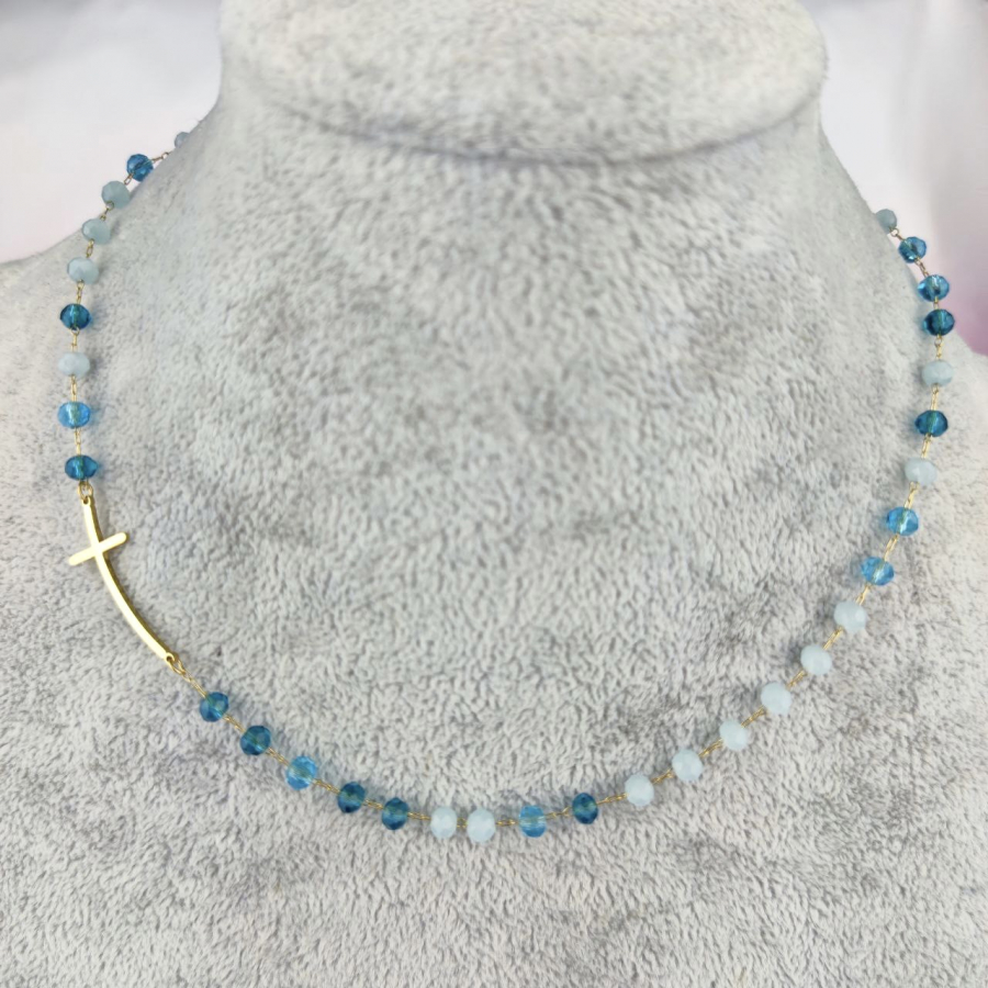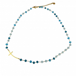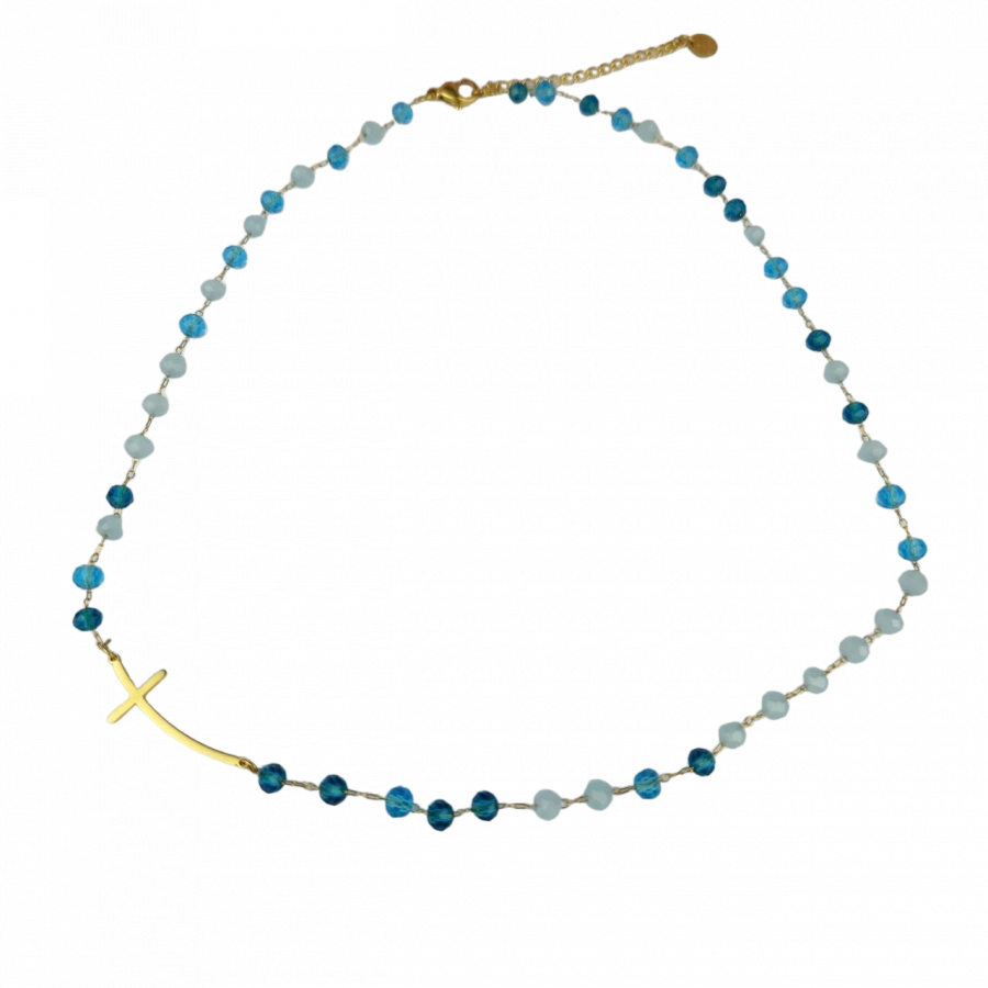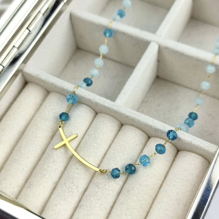 Biżuteria wykonana jest z najwyższej jakości stali chirurgicznej 316, która nie czernieje, nie uczula i jest w 100% hipoalergiczna. Naszyjnik z zagiętym krzyżem poprzecznym i paciorkami w odcieniach niebieskiego. Długość 40 cm + 5 cm przedłużka.