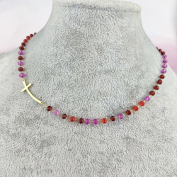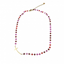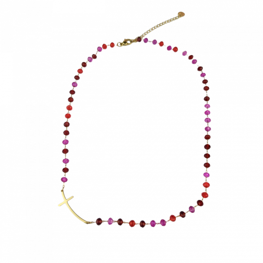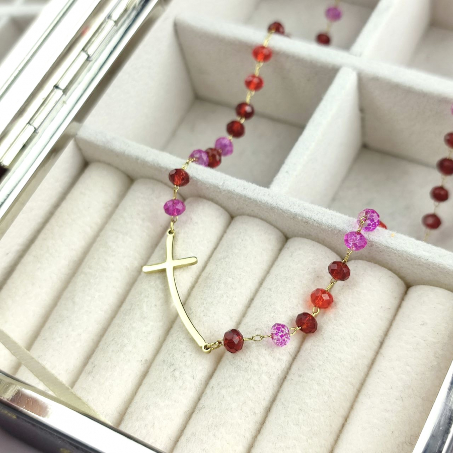 Biżuteria wykonana jest z najwyższej jakości stali chirurgicznej 316, która nie czernieje, nie uczula i jest w 100% hipoalergiczna.  Naszyjnik z zagiętym krzyżem poprzecznym i paciorkami w odcieniach różu. Długość 40 cm + 5 cm przedłużka.