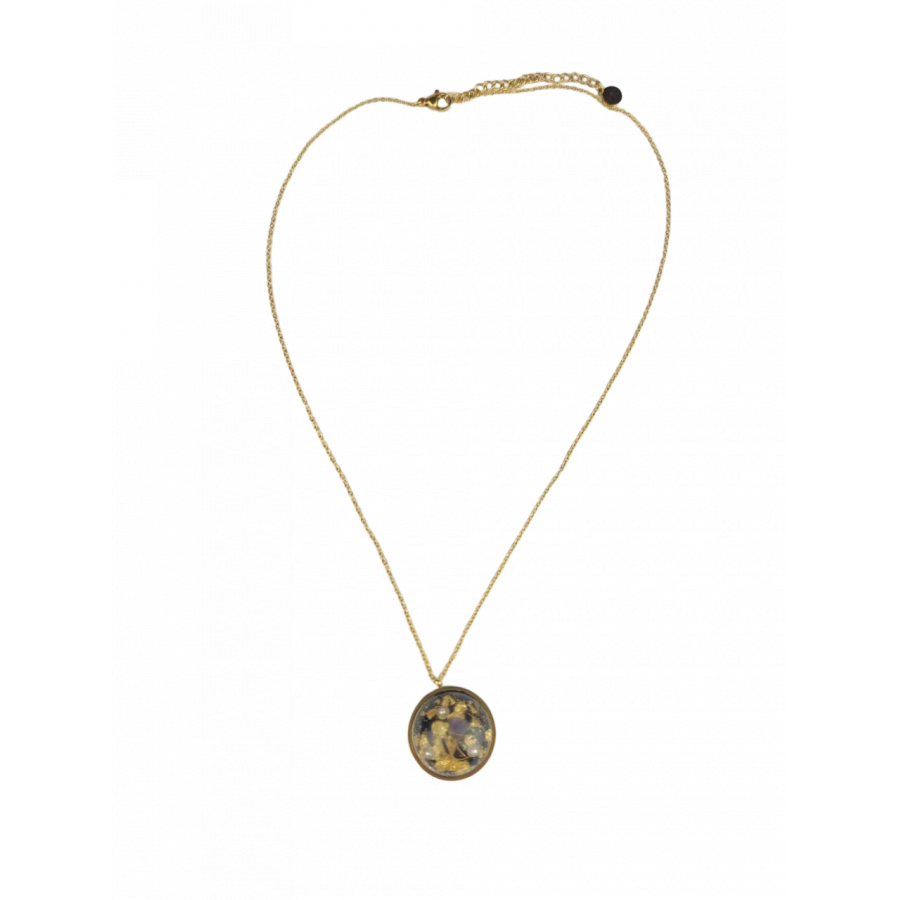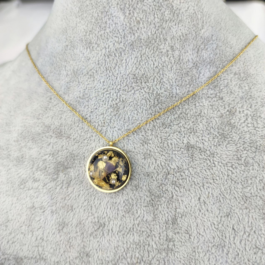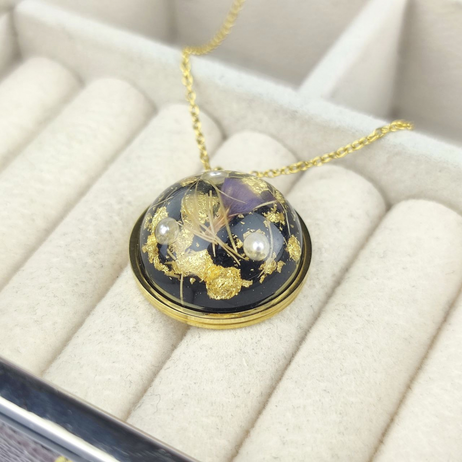 Biżuteria wykonana jest z najwyższej jakości stali chirurgicznej 316, która nie czernieje, nie uczula i jest w 100% hipoalergiczna. Naszyjnik z żywicy epoksydowej, z zatopionymi w środku perełkami, kwiatami i złotą foliąi. Cenionej marki Moonriver. Długość 46 cm + 5 cm przedłużka.