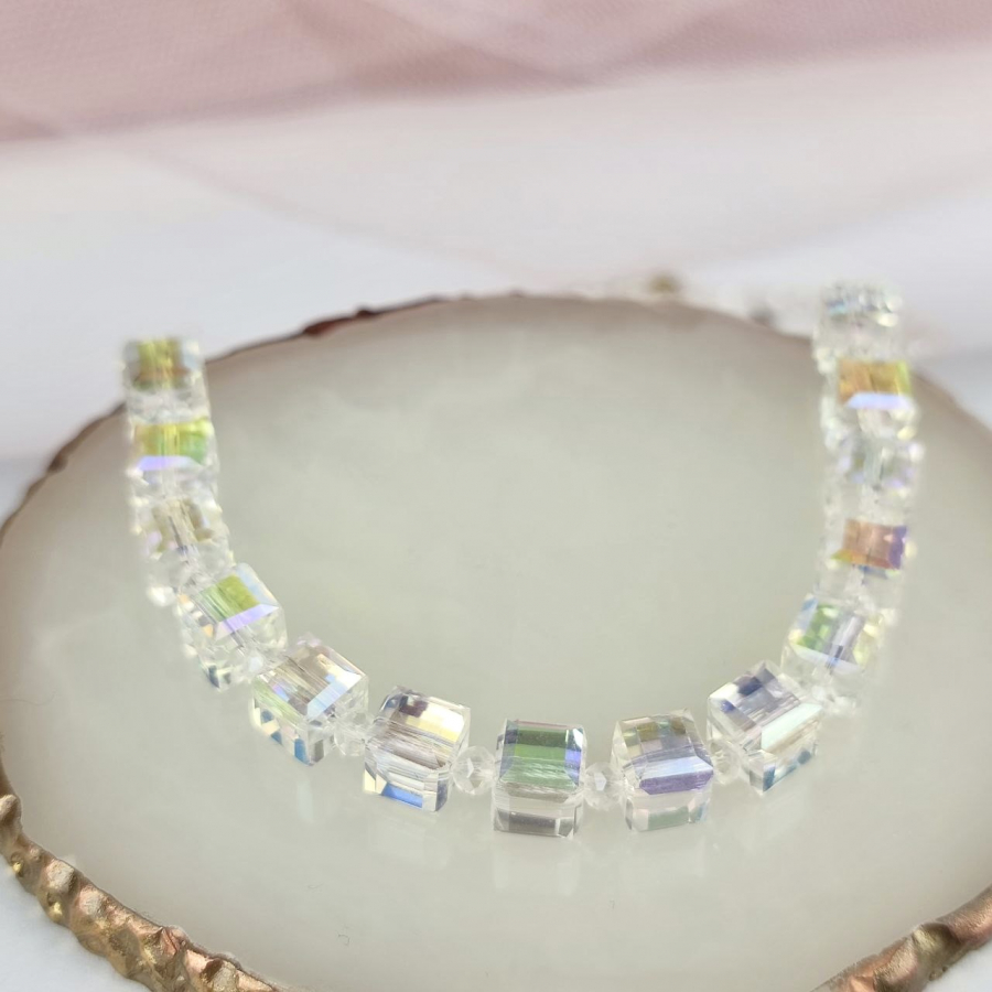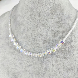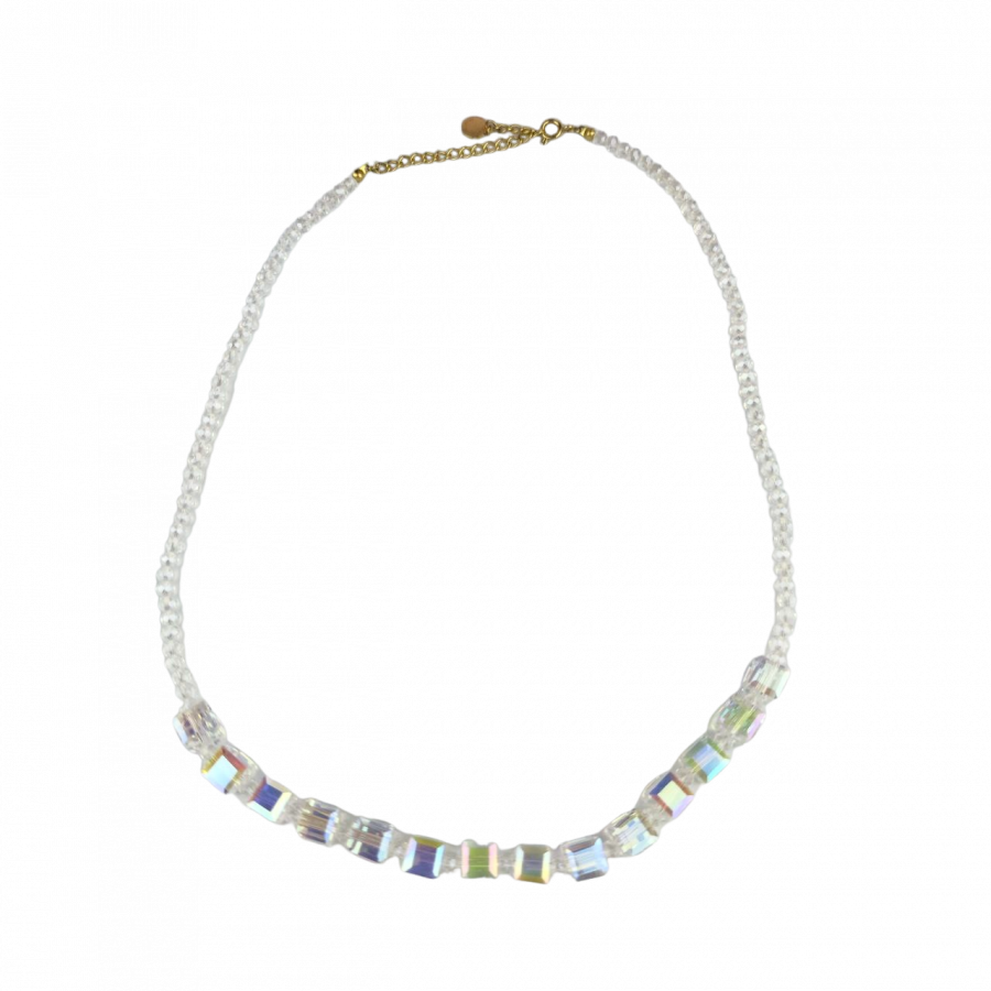 Biżuteria wykonana jest z najwyższej jakości stali chirurgicznej 316, która nie czernieje, nie uczula i jest w 100% hipoalergiczna. Naszyjnik z przeźroczystymi paciorkami i kostkami opalizującymi w multikolor. Cenionej marki Moonriver. Długość 40cm + 6 cm przedłużka.