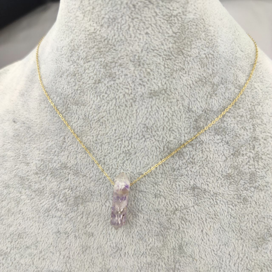 Biżuteria wykonana jest z najwyższej jakości stali chirurgicznej 316, która nie czernieje, nie uczula i jest w 100% hipoalergiczna. Naszyjnik z minerałem, w którym zatopione są kawałki fioletowego ametystu. Długość 40 cm + 5 cm przedłużka.