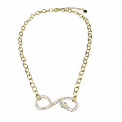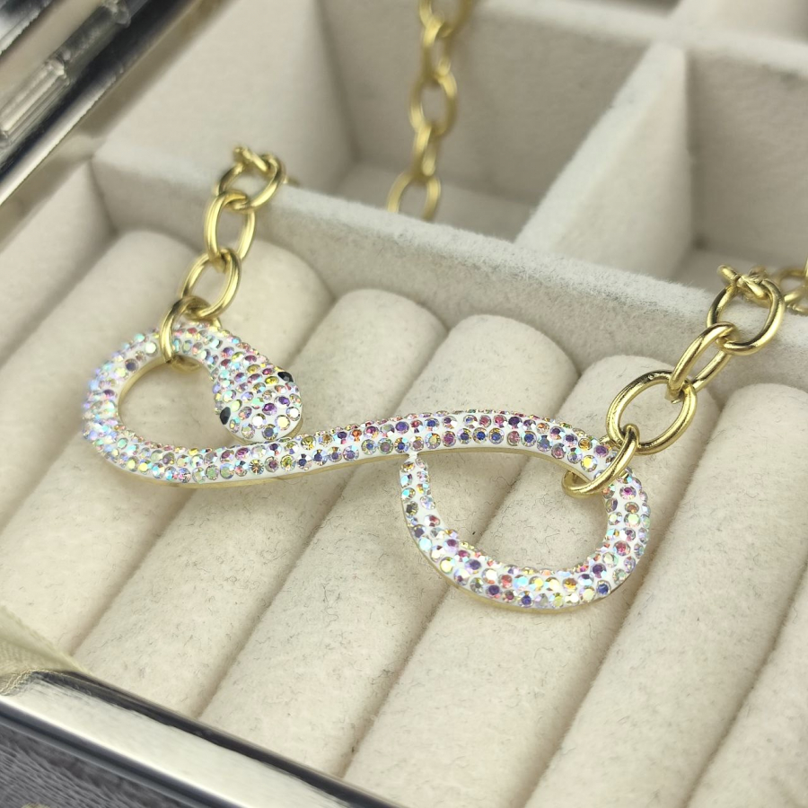 Biżuteria wykonana jest z najwyższej jakości stali chirurgicznej 316, która nie czernieje, nie uczula i jest w 100% hipoalergiczna. Naszyjnik grubszy ze żmiją zwiniętą w kształt nieskończoności, bogato wysadzana w cyrkonie multi. Cenionej marki Moonriver. Długość 41 cm + 6 cm przedłużka.