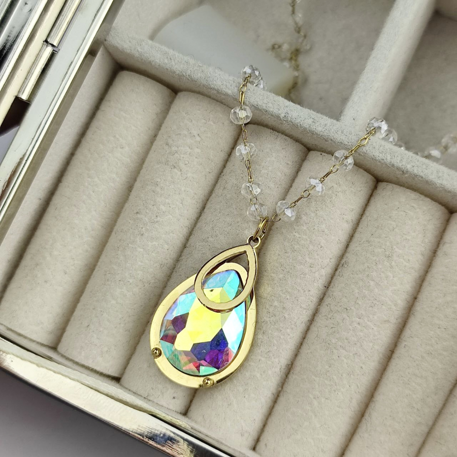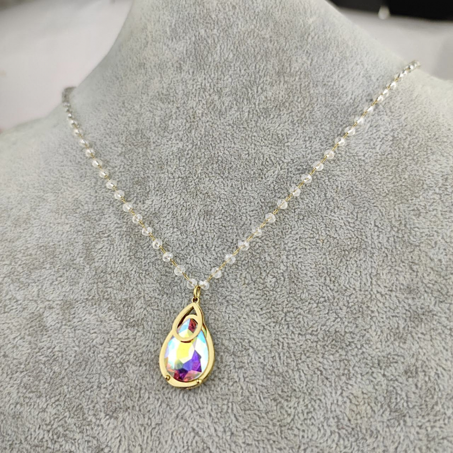 Biżuteria wykonana jest z najwyższej jakości stali chirurgicznej 316, która nie czernieje, nie uczula i jest w 100% hipoalergiczna. Naszyjnik z przeźroczystymi paciorkami z zawieszką w kształcie łezki z kryształu w kolorze multikolor. Długość 60 cm + 5 cm przedłużka.