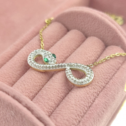 Biżuteria wykonana jest z najwyższej jakości stali chirurgicznej 316, która nie czernieje, nie uczula i jest w 100% hipoalergiczna. Naszyjnik typu celebrytka, ze żmiją zwiniętą w kształt nieskończoności, ozdobiona cyrkoniami. Długość 40 cm + 5 cm przedłużka.