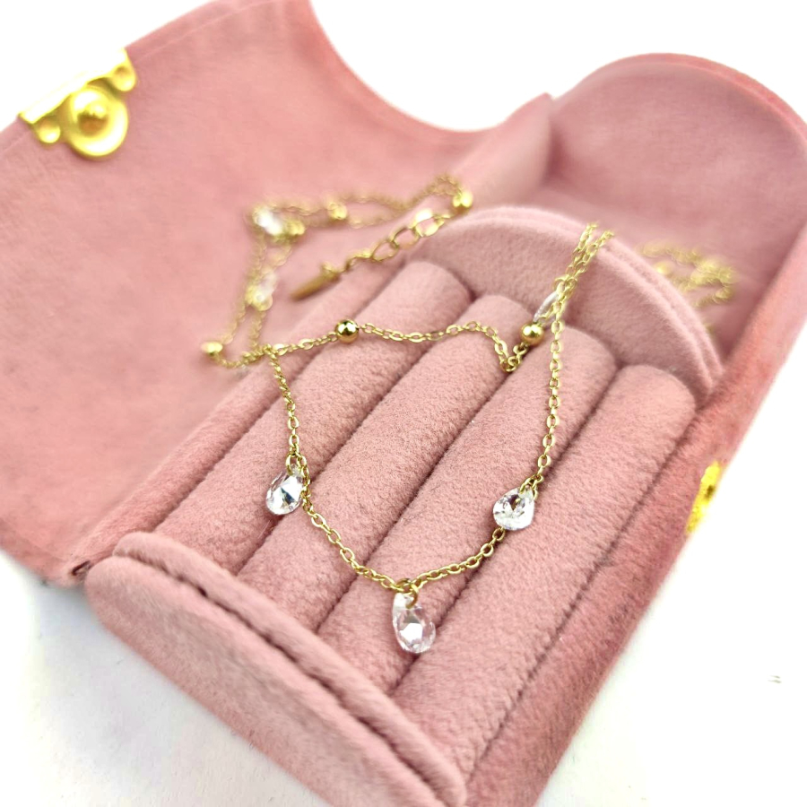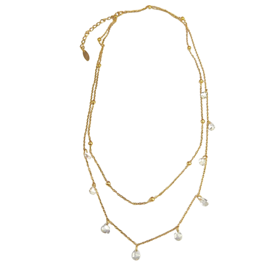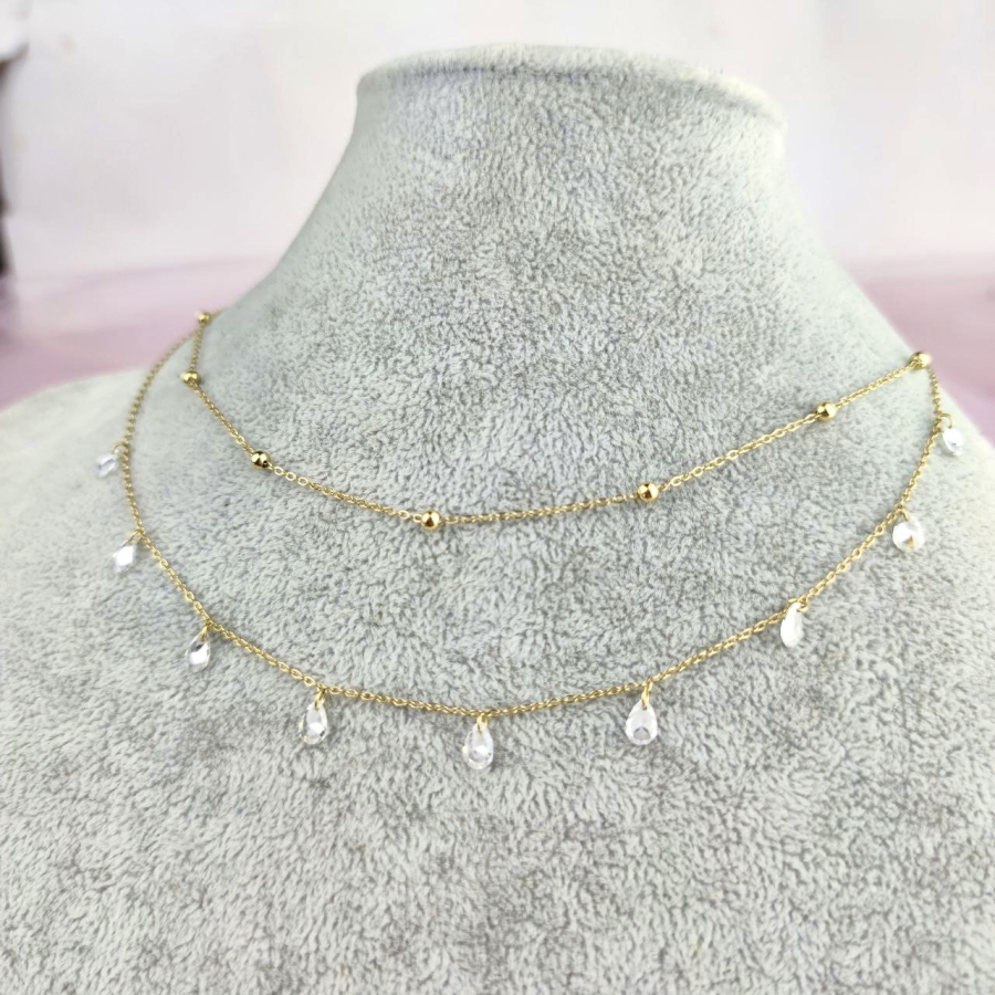 Biżuteria wykonana jest z najwyższej jakości stali chirurgicznej 316, która nie czernieje, nie uczula i jest w 100% hipoalergiczna. Naszyjnik typu celebrytka, podwójny, z kryształkami w kształcie łezki. Cenionej marki Blueberry. Długość krótszego 40 + 5 cm przedłużka, długość dłuższego 44 + 5 cm przedłużka